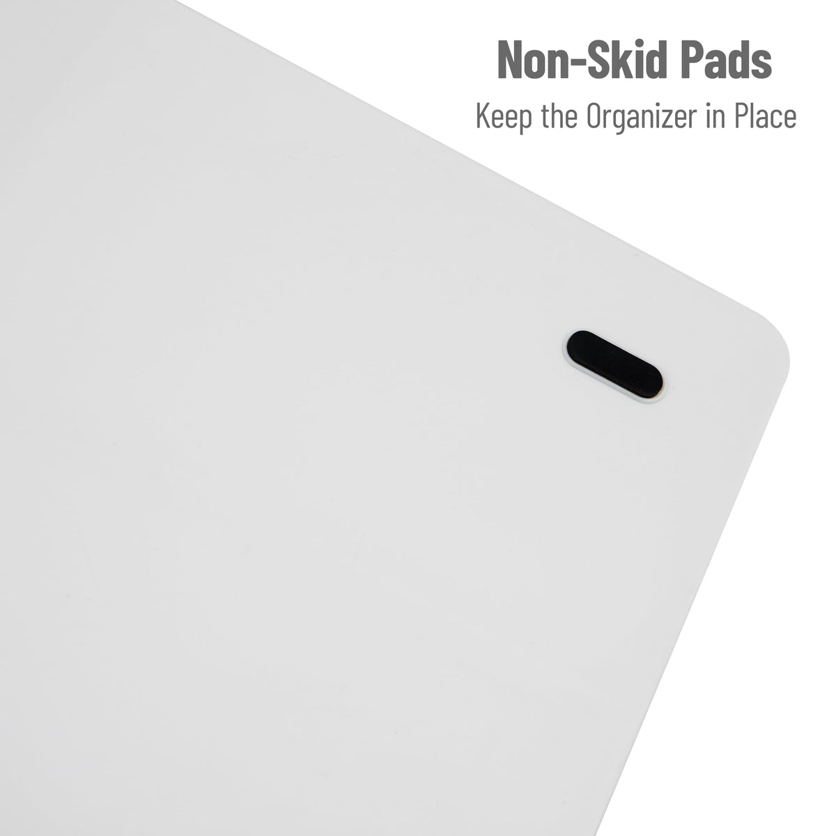 • Q: Does the organizer have any features to ensure stability? A: Yes, it includes rubber grips on the bottom to keep the organizer securely in place.