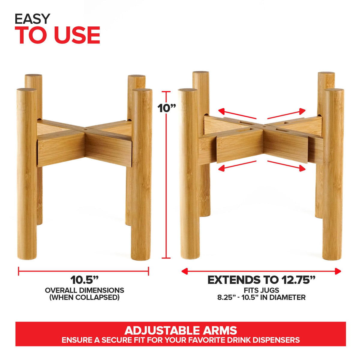 - Q: What sizes of beverage jugs does the dispenser stand accommodate? A: The adjustable beverage dispenser stand fits jugs that measure between 8 inches to 10 inches in diameter.