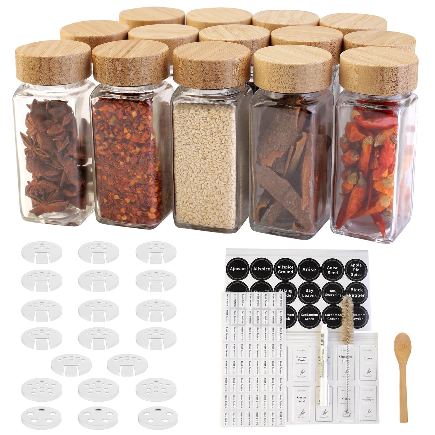 • Q: What accessories are included in the spice jar set? A: The set comes with a collapsible silicone funnel, a mini brush for cleaning, and a bamboo spoon for easy filling.