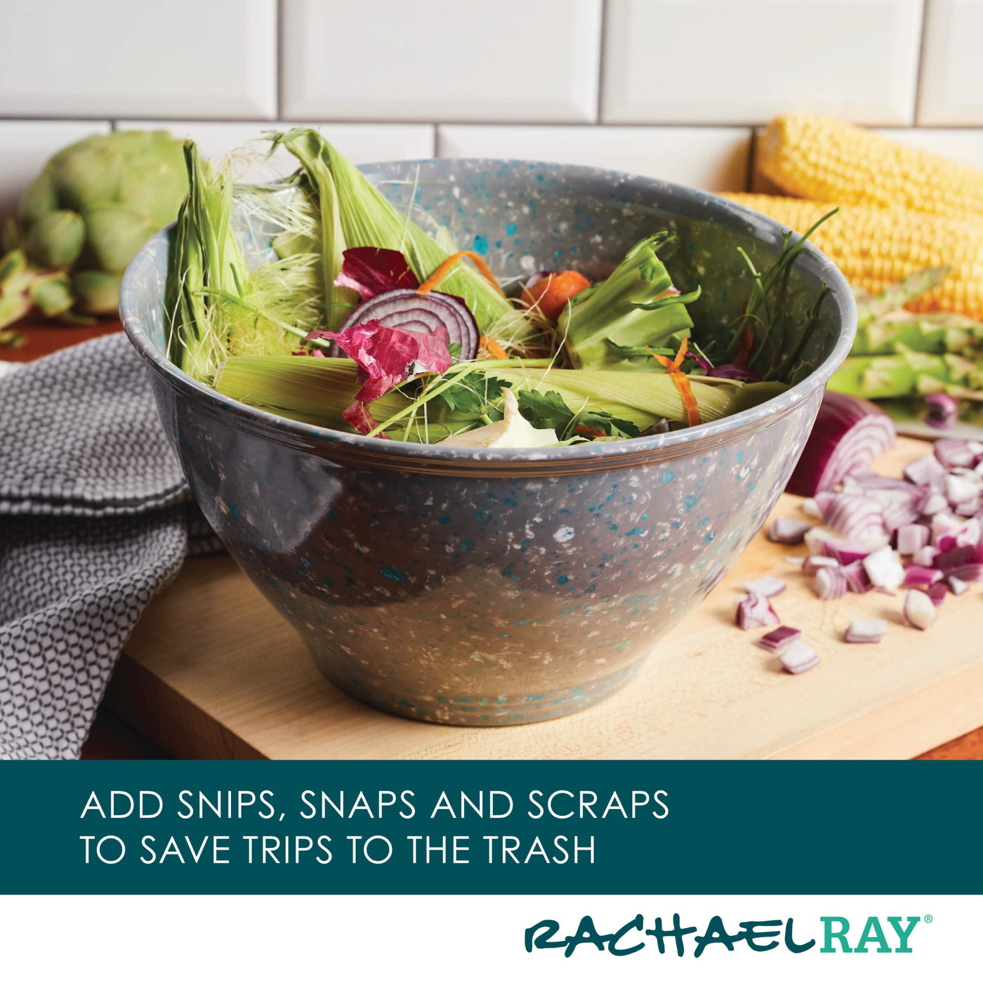 - Q: How can I use the Garbage Bowl in my kitchen? A: You can use the Garbage Bowl to collect food scraps and unusable pieces while chopping, slicing, and dicing, which helps cut down on trips to the trash can.