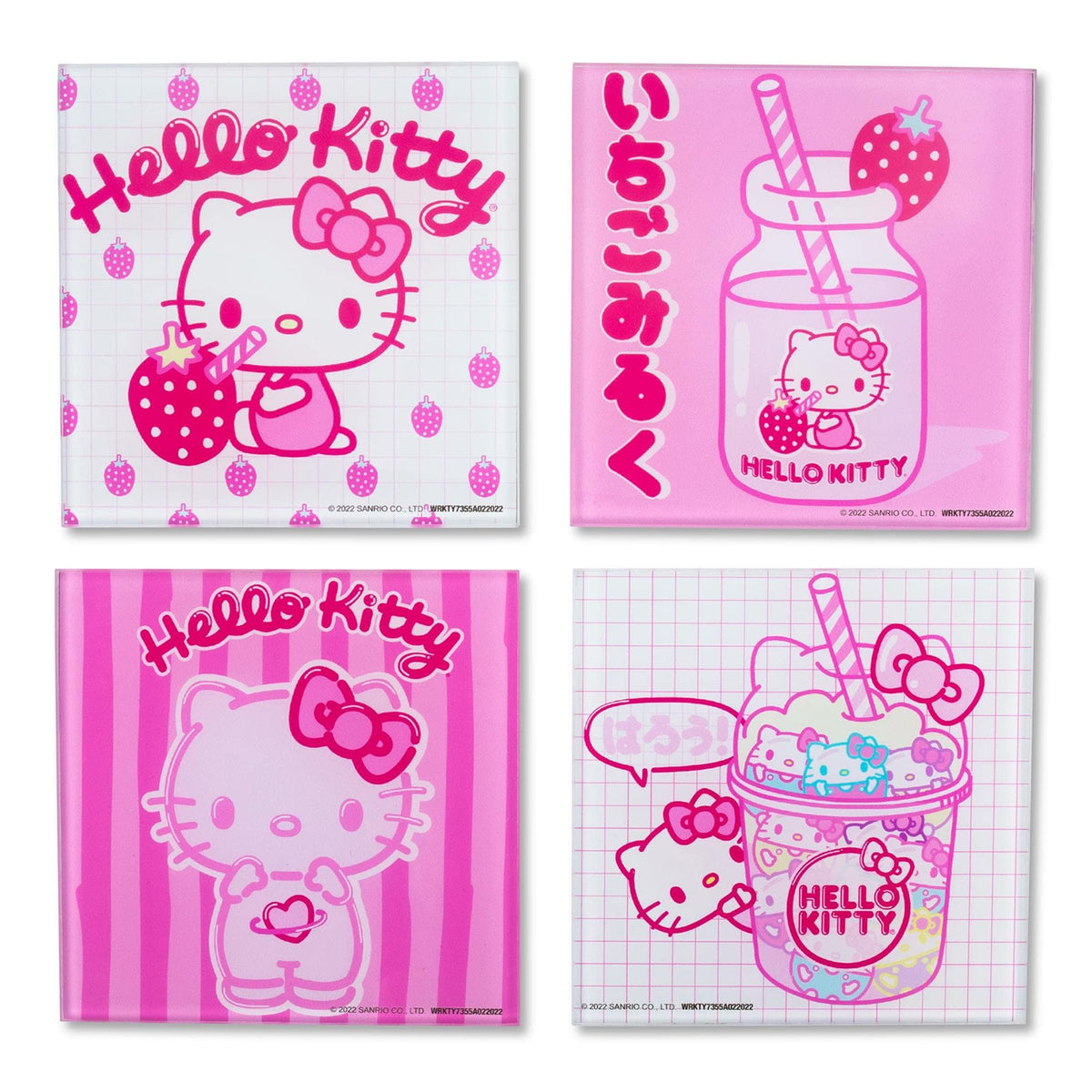 • Q: What designs are featured on the Hello Kitty coasters? A: The coasters feature various designs, including Hello Kitty drinking strawberry milk, a boba tea, and a glass milk bottle.