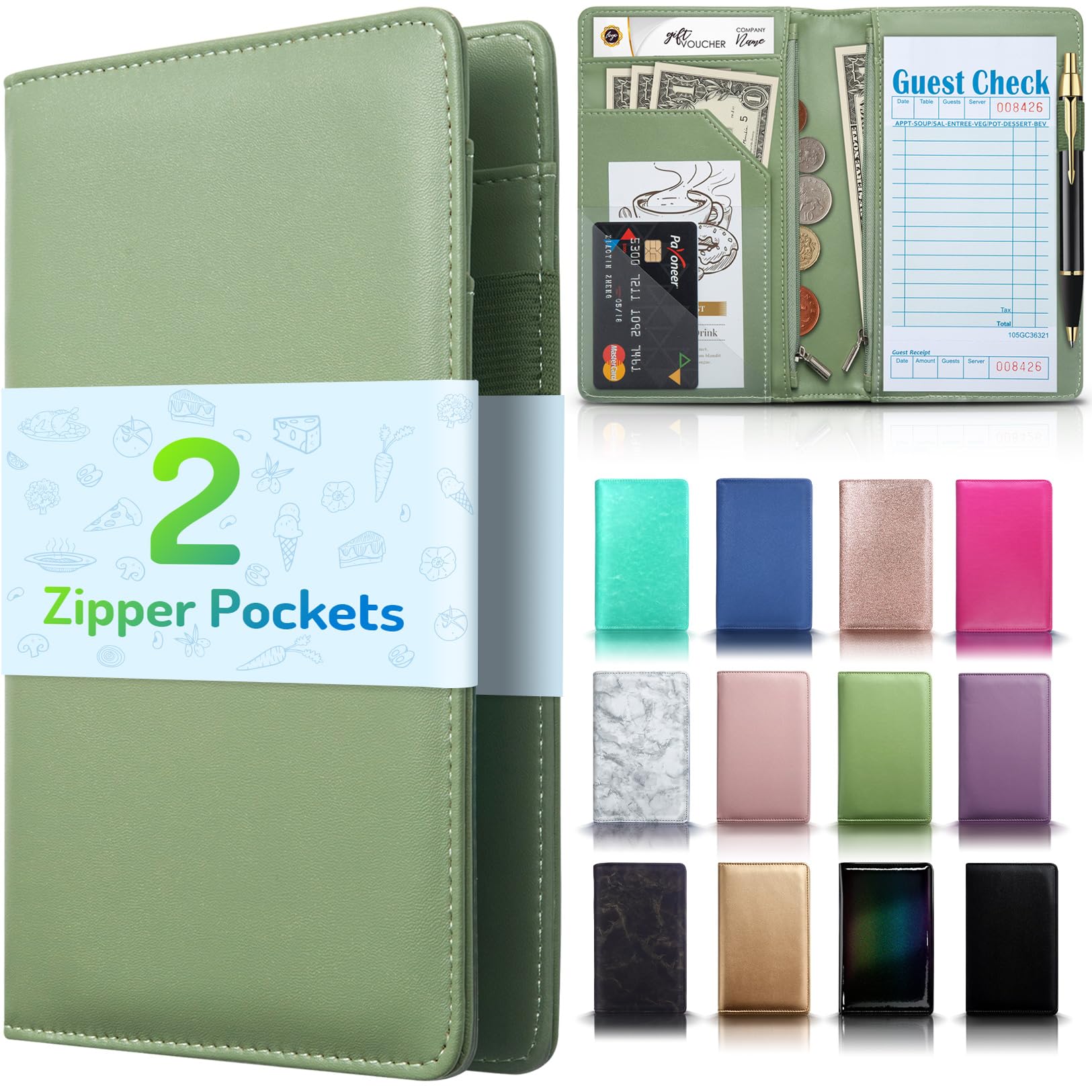 Server Book with 2 Zipper Pockets Leather Server Books for Waitress Waiter Book Durable Waitress Book with Money Pocket and Zipper Waiter Wallet Server Booklet Fit Server Apron (Grass Green)