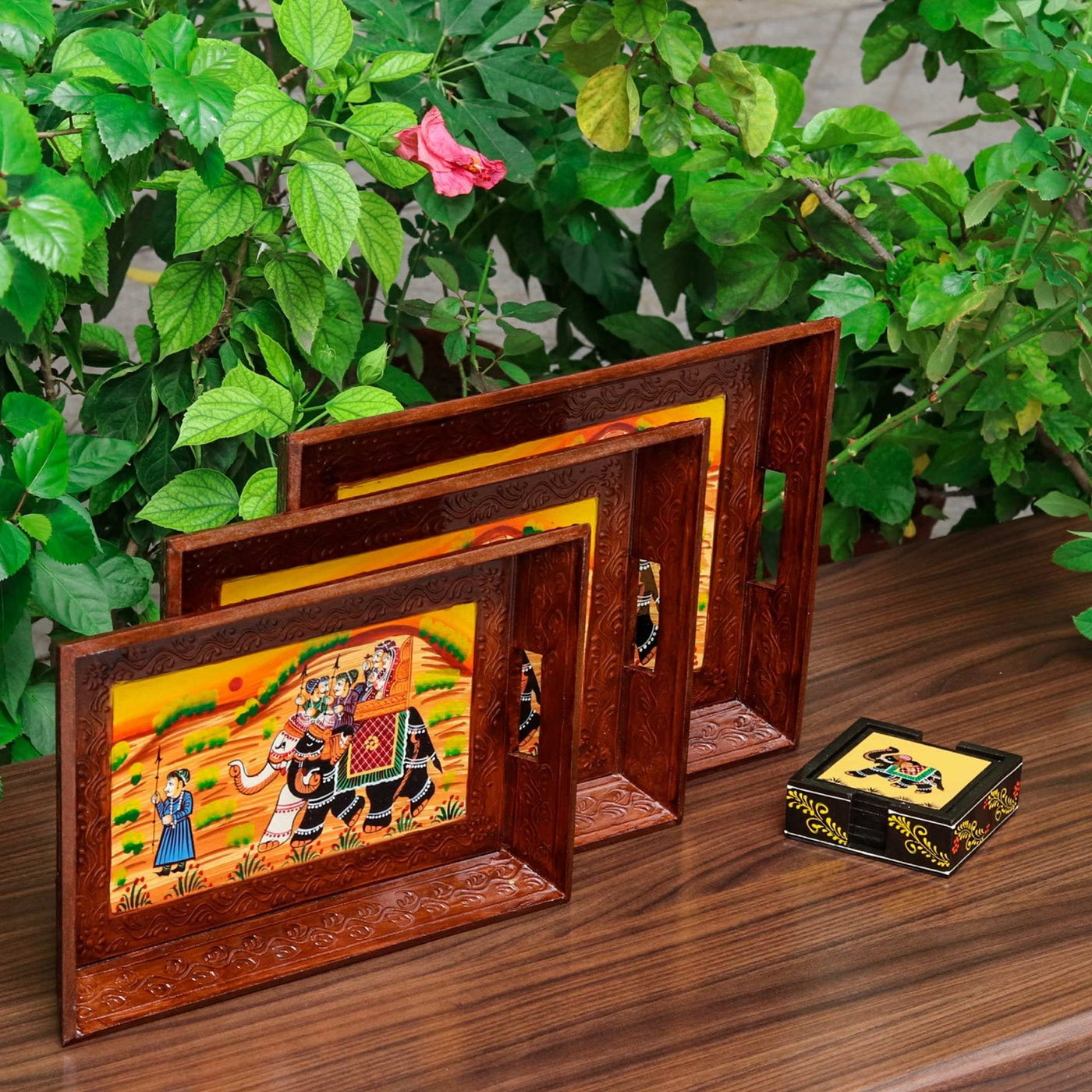 Swadeshi Blessings Wooden Serving Tray Set- Handcrafted & Hand-Painted For Kitchen/Table & Home Decor/Dinning/Gifts/Restaurants/