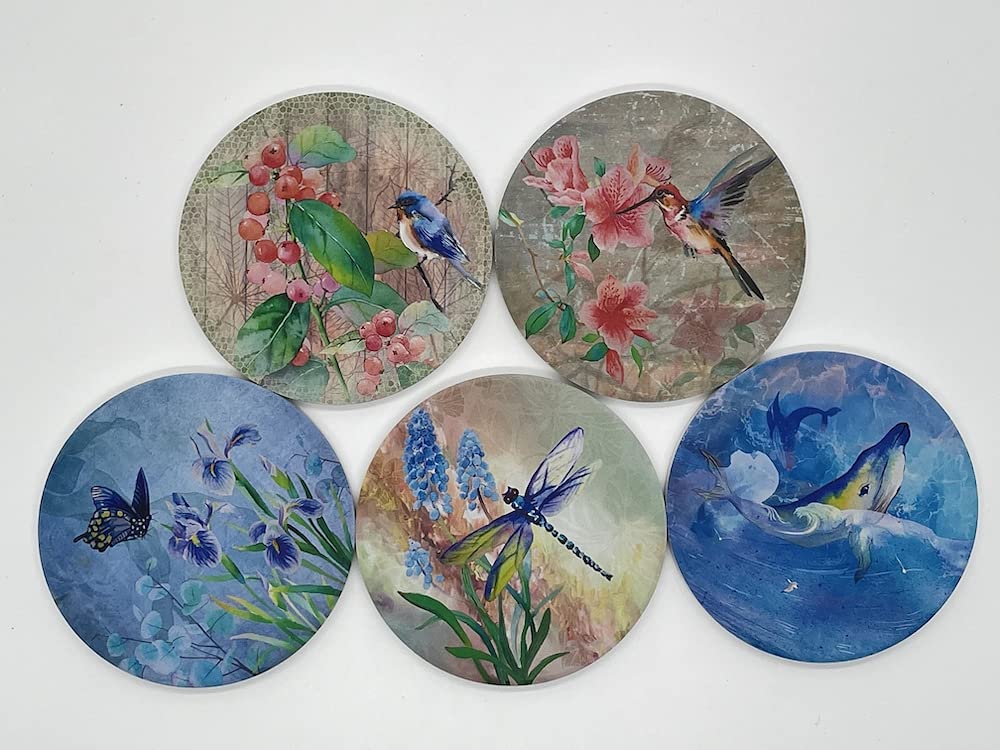 Trinsi Coasters For Drinks, Set Of 10 Absorbent Ceramic Stone Coasters, Natures, With Cork Back 5 Designs