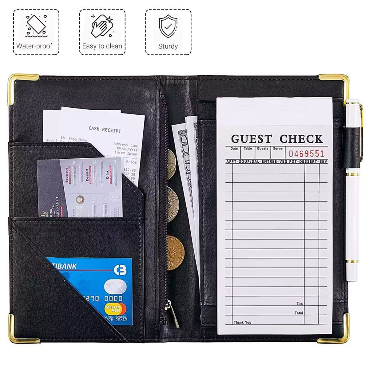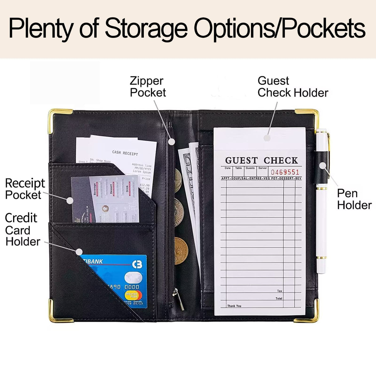 • Q: How many pockets does the server book have? A: The server book features seven pockets, including slots for credit cards, menus, bills, coins, cash, a guest check pad, and a pen holder.