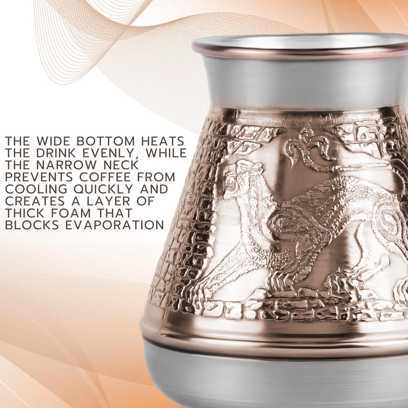 • Q: What makes copper a good material for a cezve? A: Copper offers excellent heat conductivity, which helps achieve uniform heating and prevents scorching, making it ideal for brewing coffee.