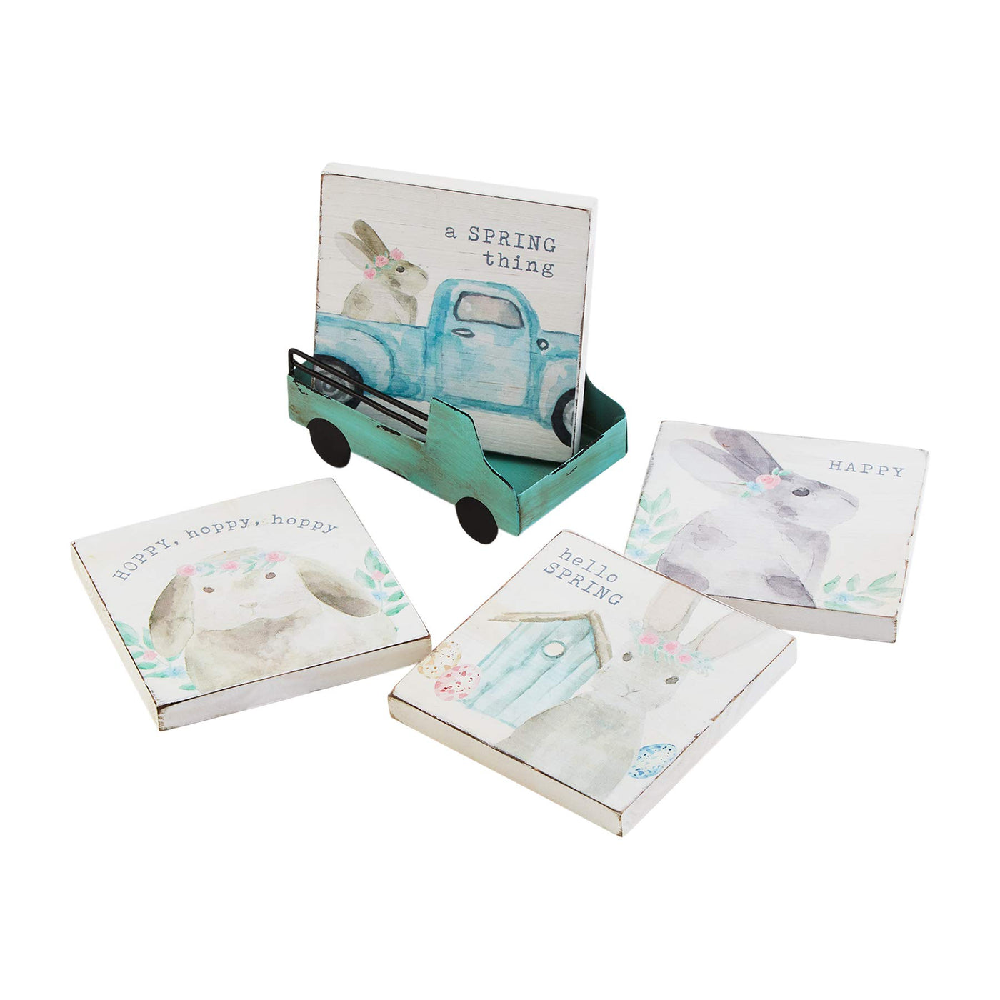 • Q: What materials are the Wooden Bunny Coasters made from? A: The Wooden Bunny Coasters are made from high-quality wood with a watercolor print finish.