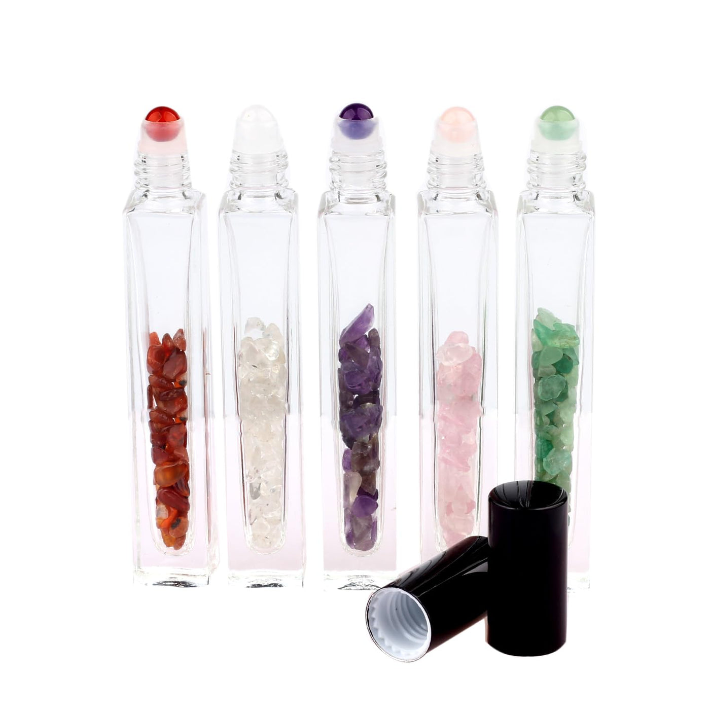 10Ml Gemstone Roller Square Bottles Refillable Roll On Bottles Healing Crystal Chips Inside For Perfumes Aromatherapy Oils 5Pack