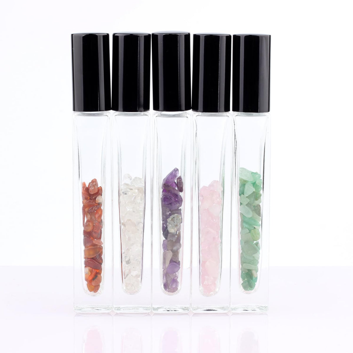 • Q: What types of gemstones are included with the roller bottles? A: The set includes roller balls topped with Green Aventurine, Clear Quartz, Amethyst, Rose Quartz, and Carnelian.