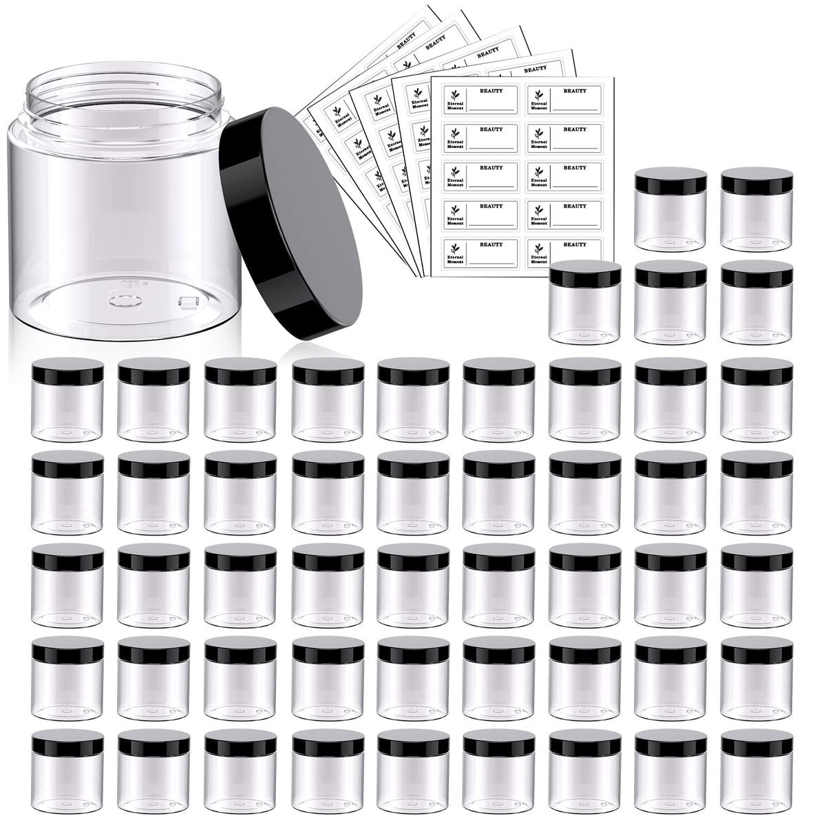 • Q: How many jars are included in the pack? A: The pack includes 50 clear 2 oz plastic jars with black lids.