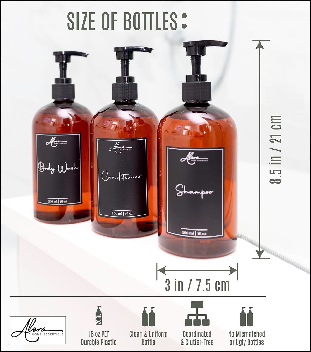 Alora 5-In-1 Apothecary Bottles For Home & Commercial Use - 16Oz Elegant 8.5X3In Refillable Amber Shampoo Storage, Handwash, Mas