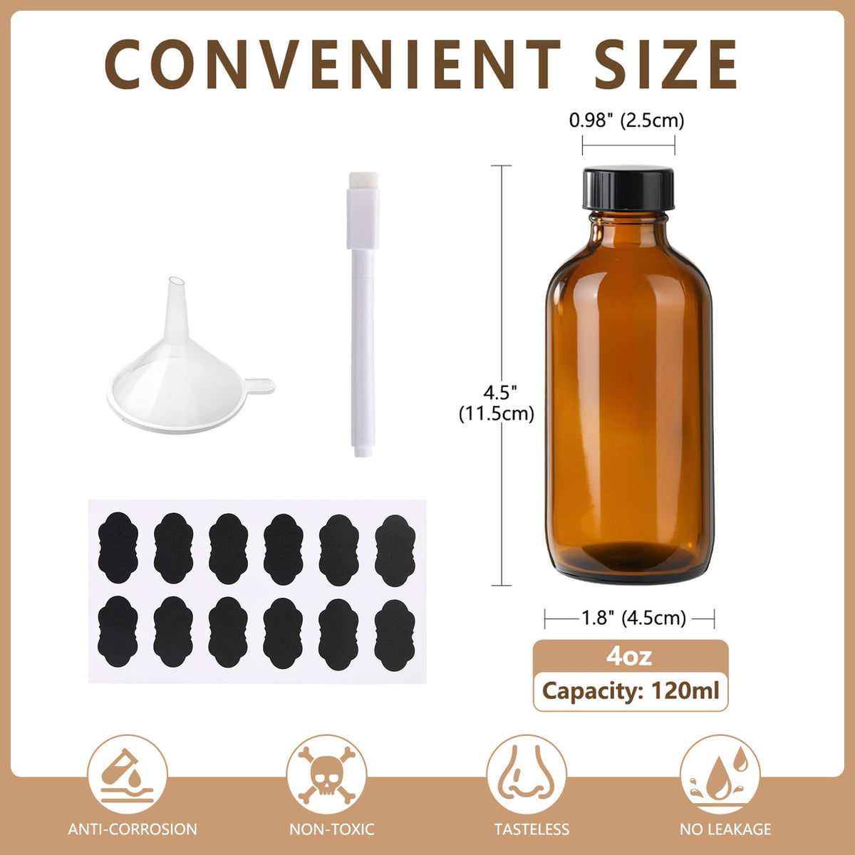 BPFY 24 Pack 4 oz Amber Boston Glass Bottle with Black Poly Cap Funnel Chalk Labels Pen for Homemade Vanilla Extract Essential Oils Herbal Medicine Wedding Christmas Holiday Gift