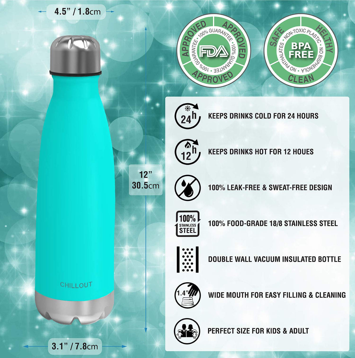 - Q: What colors are available for this water bottle? A: The CHILLOUT LIFE Stainless Steel Water Bottle comes in various bright and stylish colors.