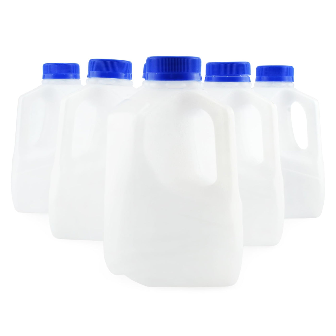 - Q: What color are the jugs and their caps? A: The jugs are semi-transparent with a natural color, and they come with blue caps.