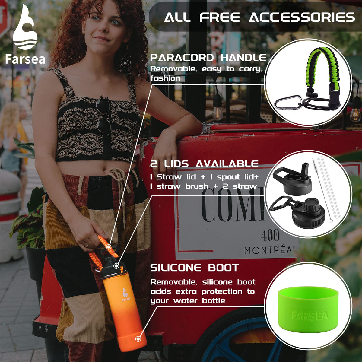 Farsea Insulated Water Bottle With Paracord Handle Protective Silicone Boot and 2 Lids (Straw Lid & Spout Lid) Stainless Steel Water Bottle Wide Mouth Double Wall Sweat-Proof BPA-Free 18 oz