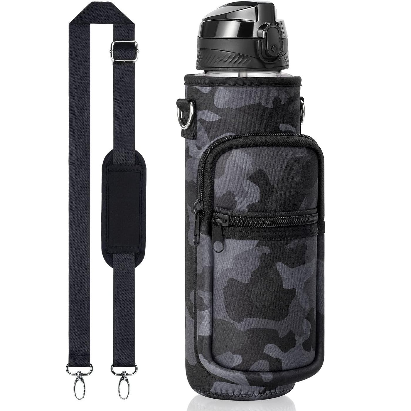 Fimibuke 32 oz Water Bottle with Sleeve - BPA Free Leakproof Sport Large 1L Plastic Motivational Water Bottle with Straw Strap Insulated Neoprene Holder Carrier Bag for Kid Women Men(A8.Camo)