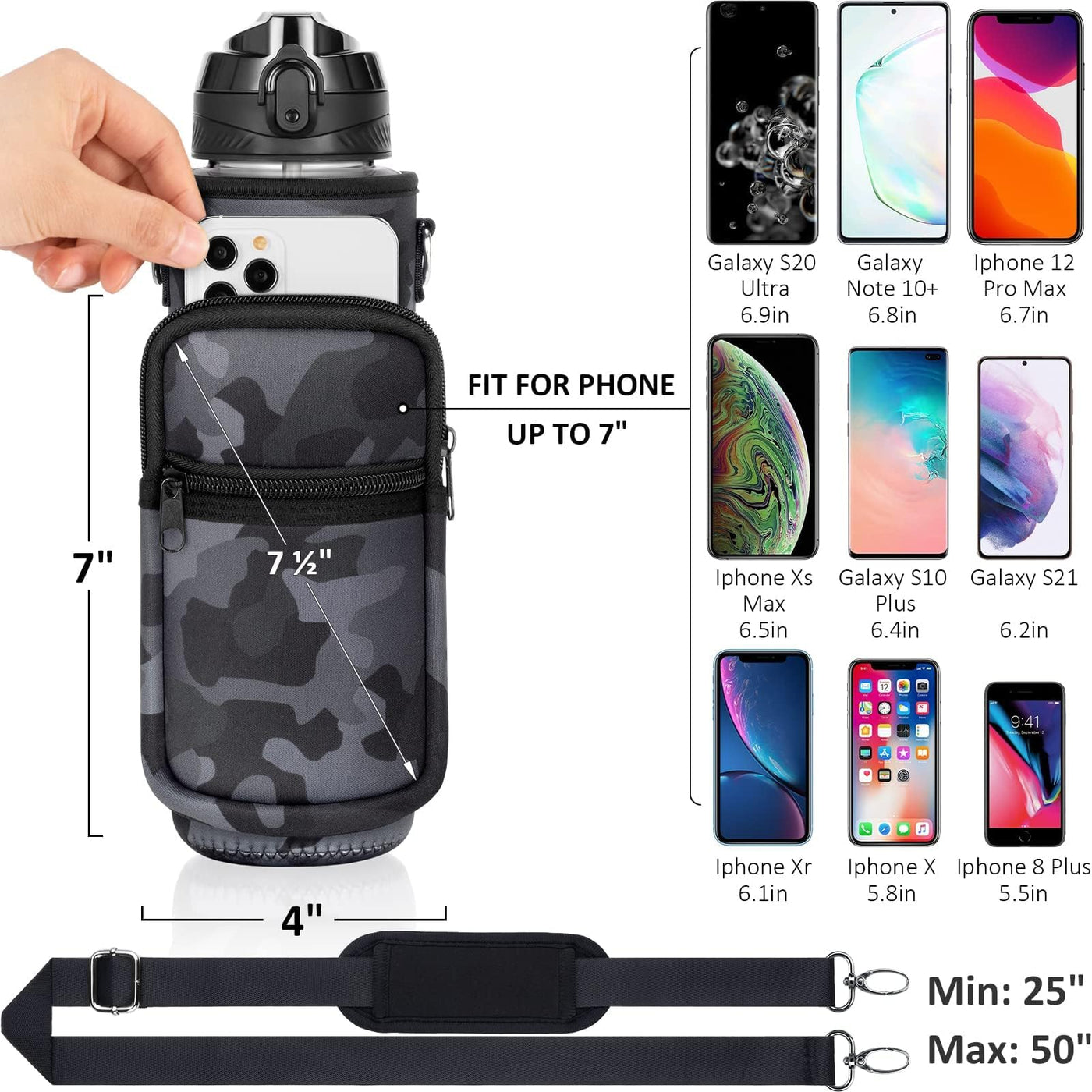 - Q: What size smartphones can fit in the water bottle sleeve's pocket? A: The large pocket of the neoprene sleeve can accommodate most smartphones up to 7 inches in size.