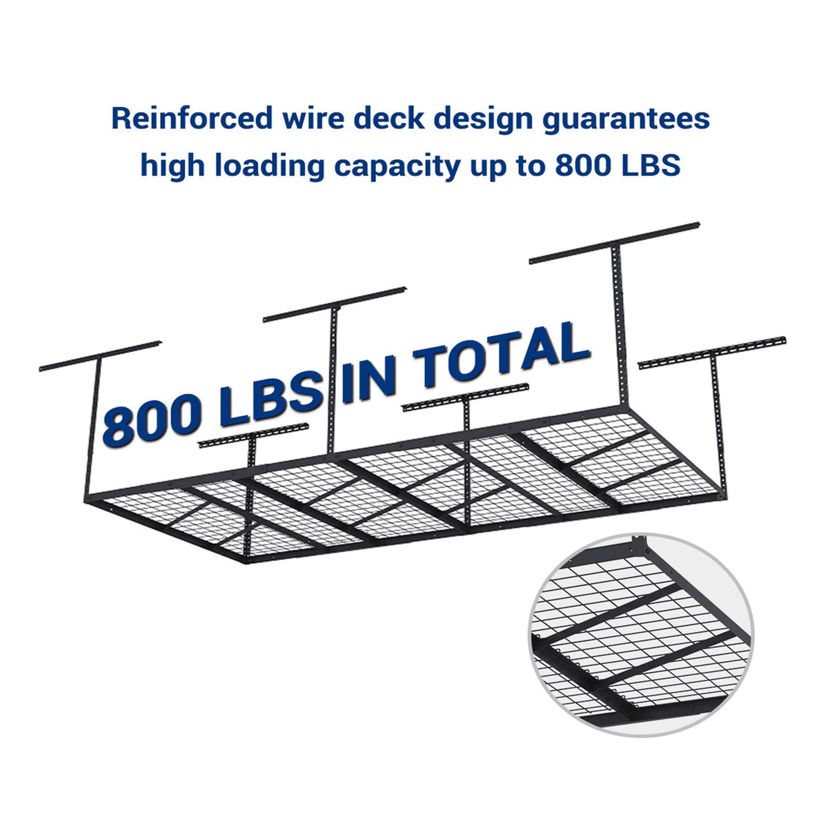 - Q: What is the weight capacity of the FLEXIMOUNTS Pro 4x8 Overhead Garage Storage Rack? A: The FLEXIMOUNTS Pro 4x8 Overhead Garage Storage Rack has a weight capacity of up to 800 pounds.