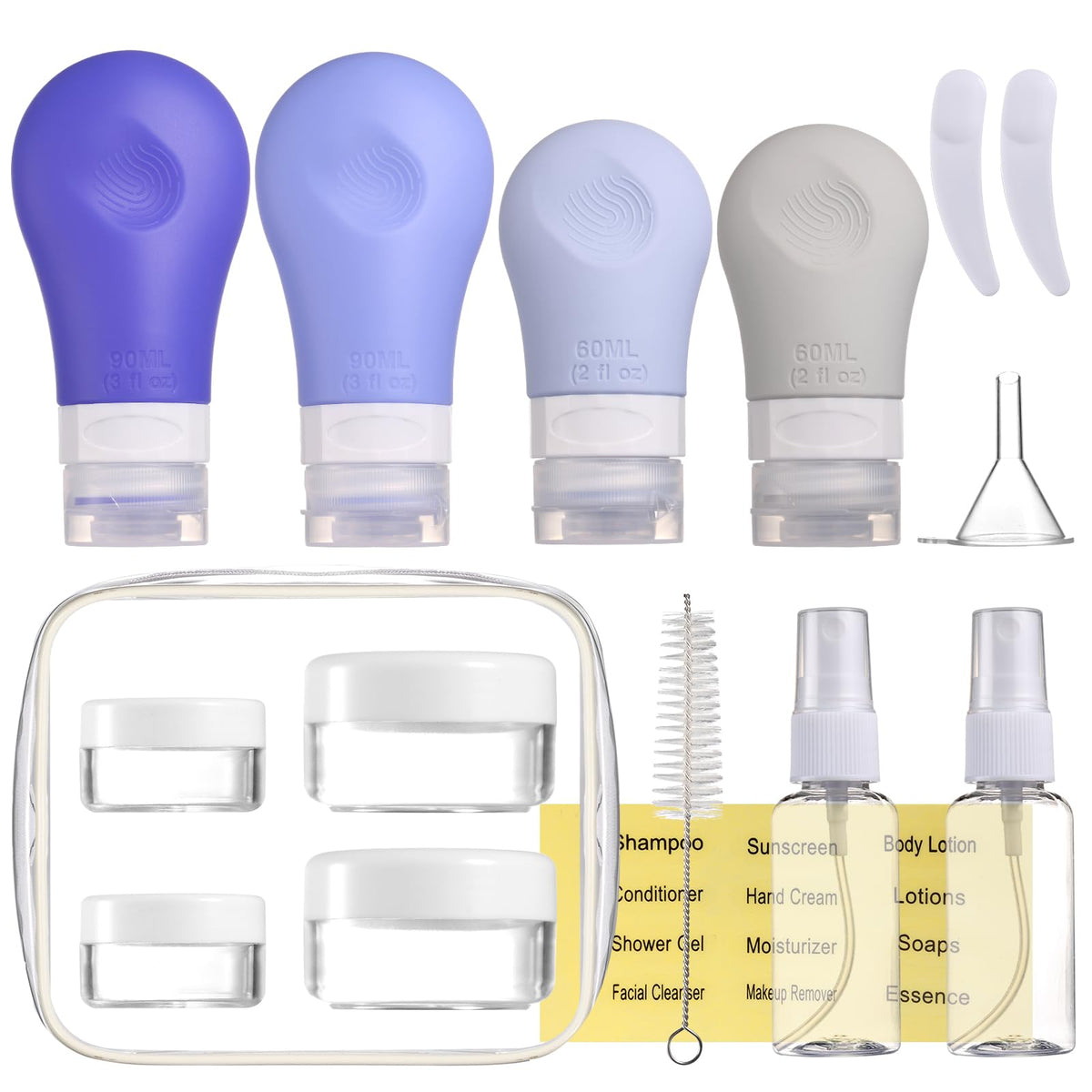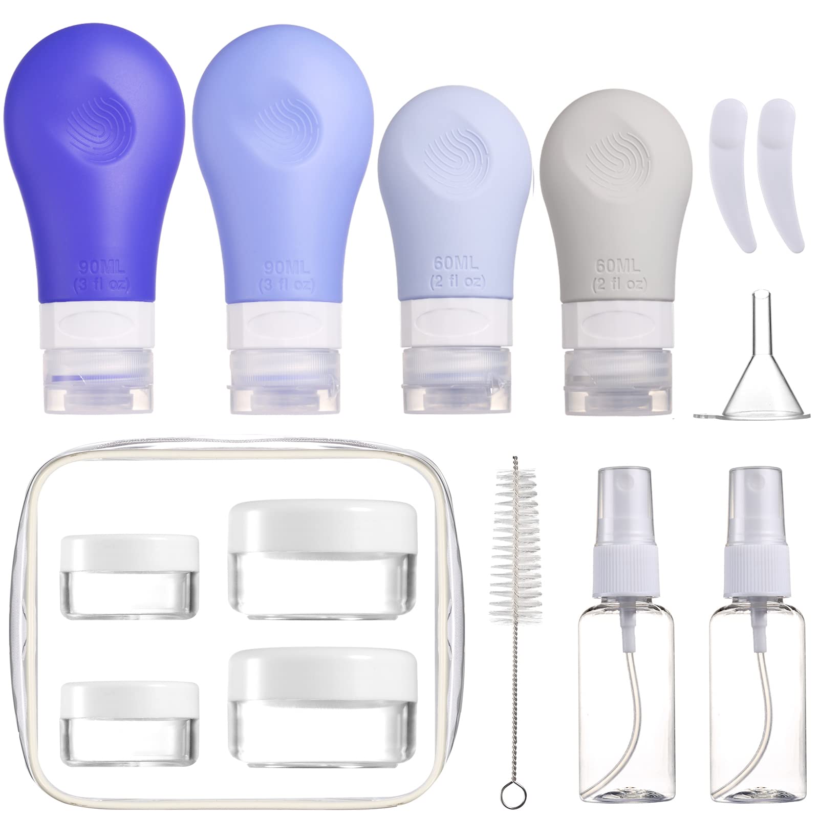 - Q: What is included in the Gemice 16 Pack Silicone Travel Bottles Set? A: The set includes 4 travel bottles, 4 travel jars, 2 spray bottles, 2 scoops, 1 funnel, 1 cleaning brush, 1 page label, and 1 clear toiletry bag.