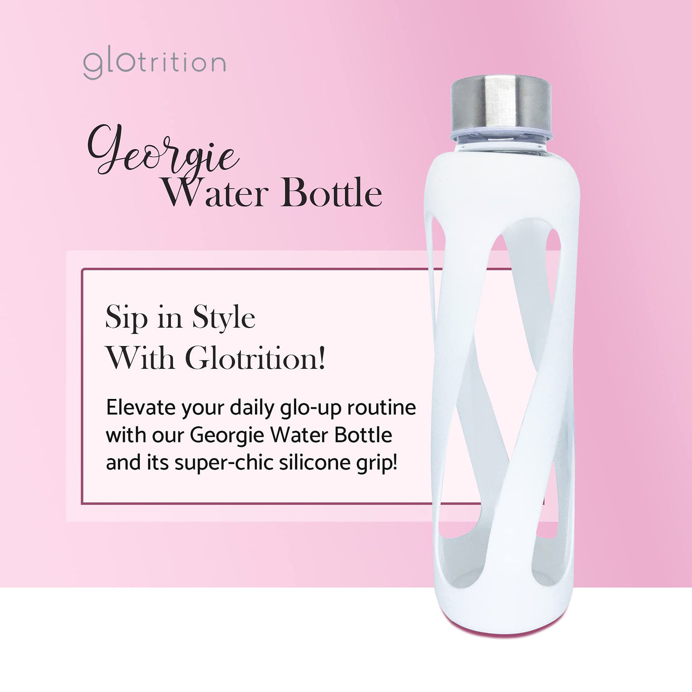 - Q: How does this water bottle enhance skin health? A: The Glotrition Georgie water bottle is designed to be used with Glotrition's Super Beauty Elixir, which is intended to support skin health.