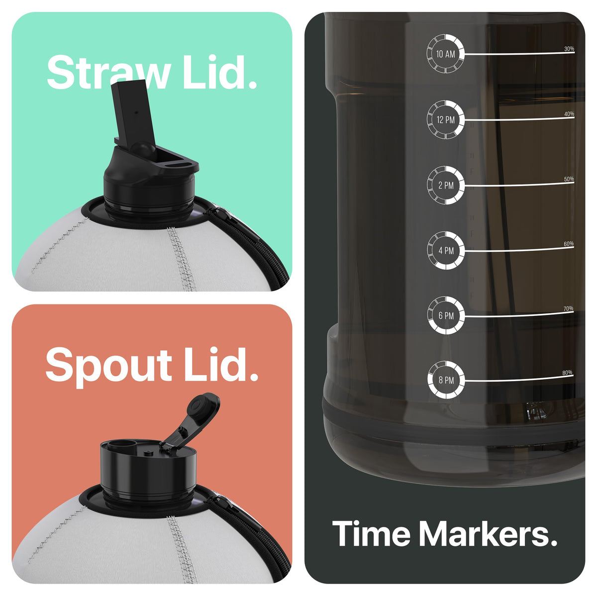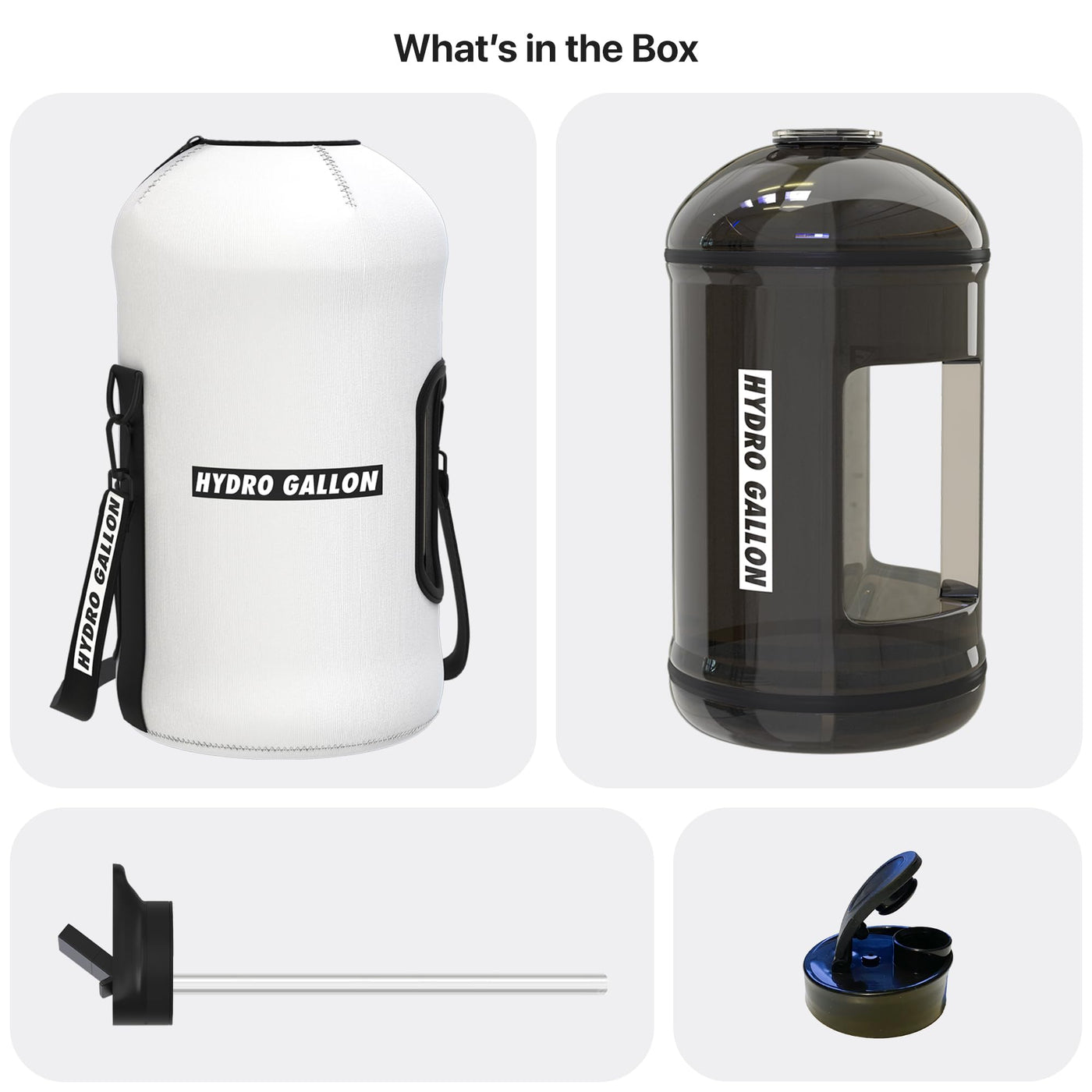 - Q: What is included in the box with the Hydro Gallon? A: The box includes the 1 gallon bottle, an insulated sleeve, adjustable shoulder straps, a straw lid with a detachable straw, and a spout lid.