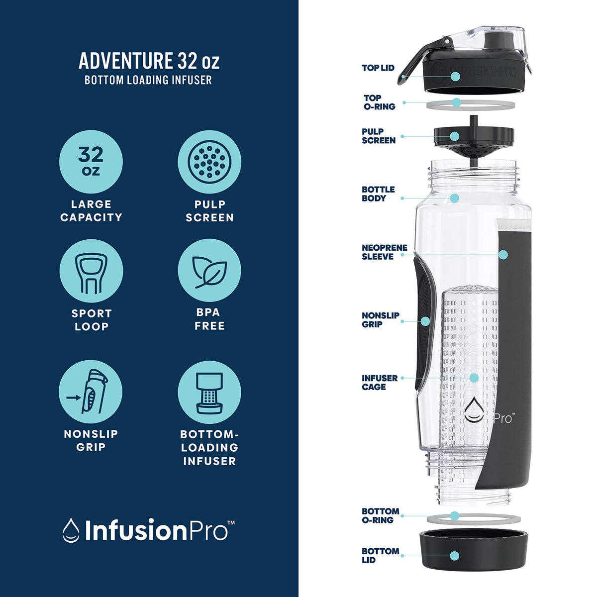 Infusion Pro 32 oz Fruit Infuser Water Bottle with Insulated Sleeve & 50 Recipe Fruit Infusion Water eBook : Bottom Loading Large Water Infuser for More Flavor : Unique Gift Idea for Women