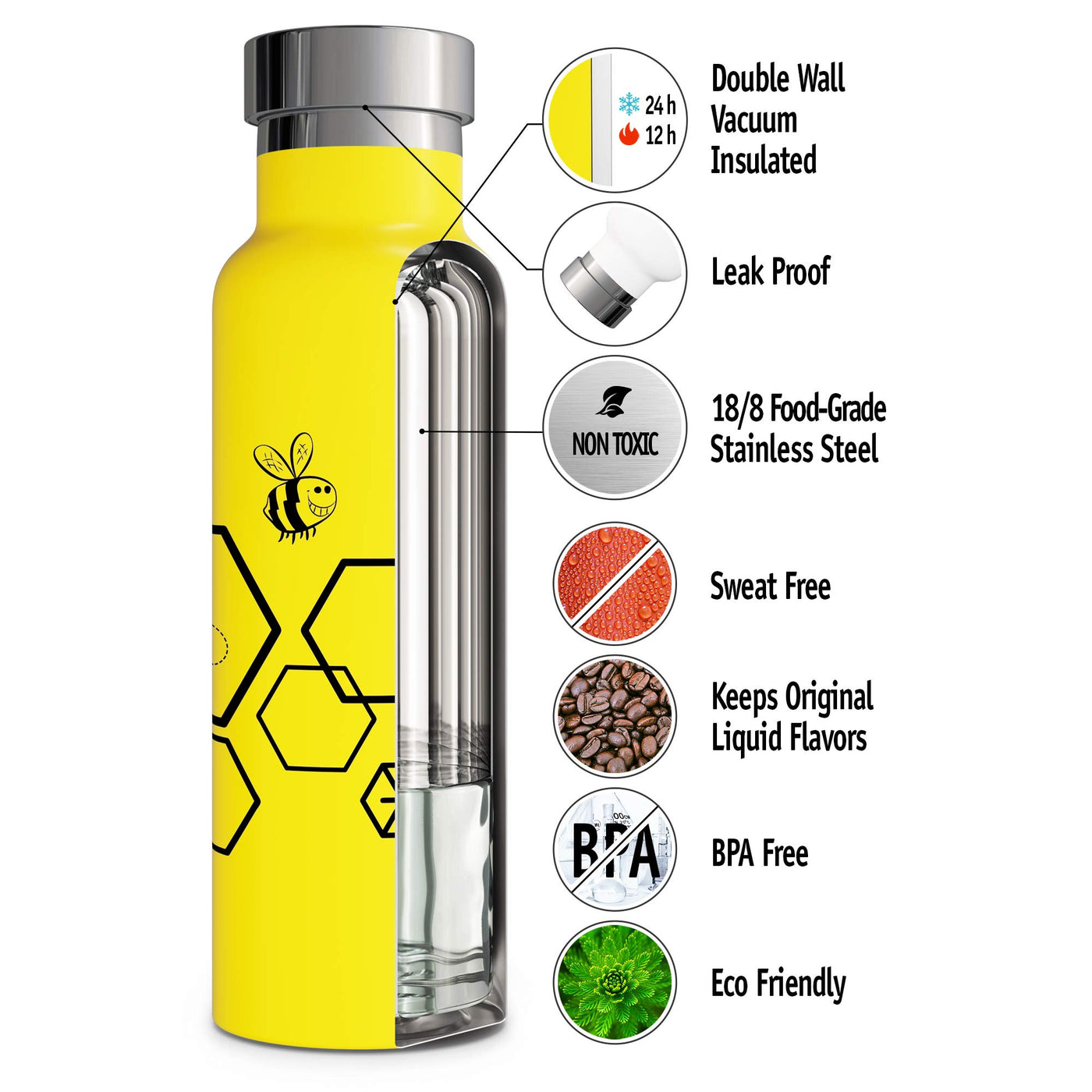 Involve & Evolve Insulated Water Bottle with 3 Lids (Straw Lid) Kids Reusable Double Walled Stainless Steel Flask Metal Bee Happy Thermos 12oz 17oz 20oz 25oz (20 oz Yellow)