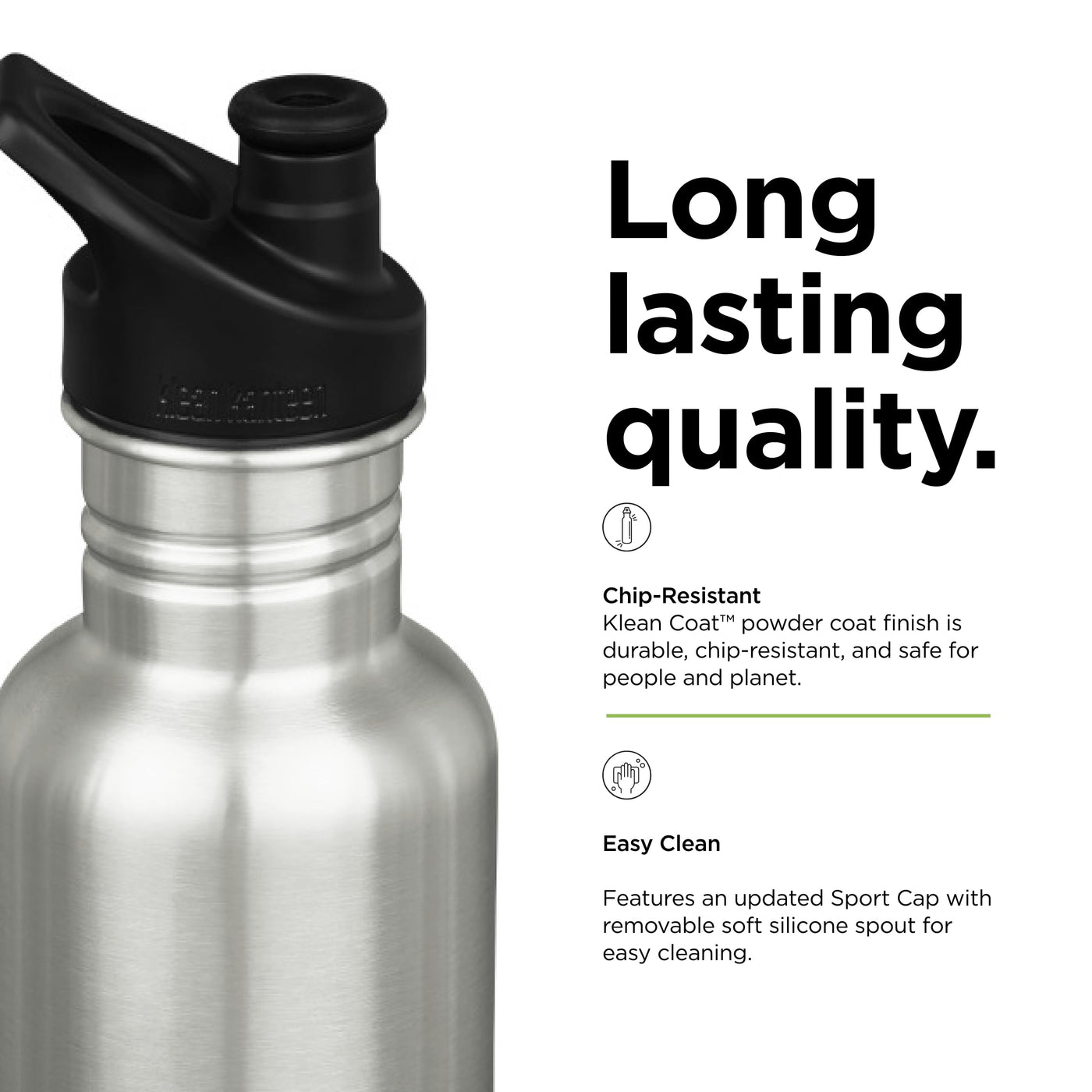 • Q: Is the finish on the Klean Kanteen Classic durable? A: Yes, it has a chip-resistant Klean Coat finish that enhances its durability and appearance.