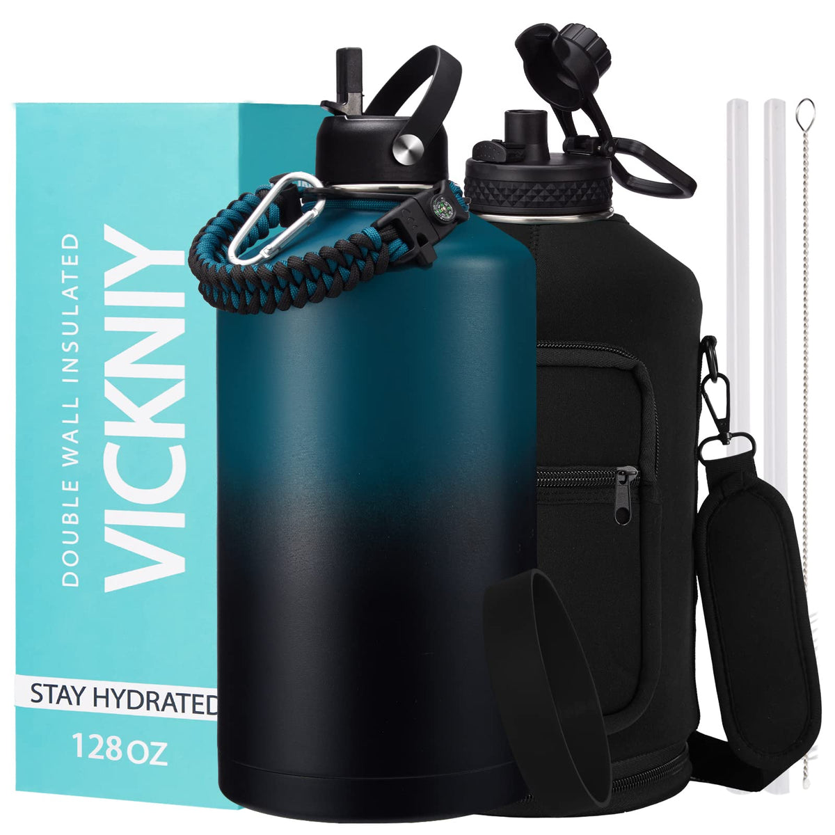 - Q: What is the capacity of the water bottle? A: The VICKNIY insulated water bottle has a capacity of 128 ounces, making it ideal for staying hydrated throughout the day.