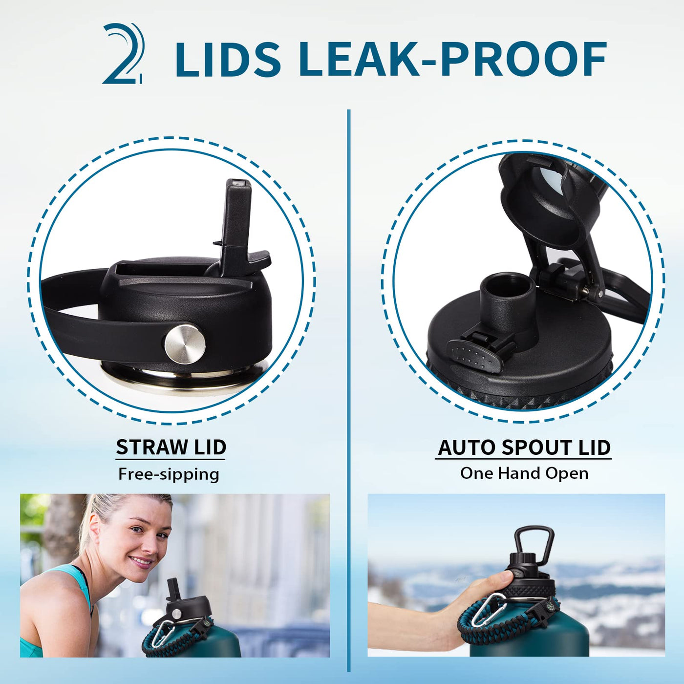 - Q: What types of lids come with the water bottle? A: The water bottle includes two types of lids: a spill-proof straw lid for easy sipping and an auto spout chug lid for fast drinking.