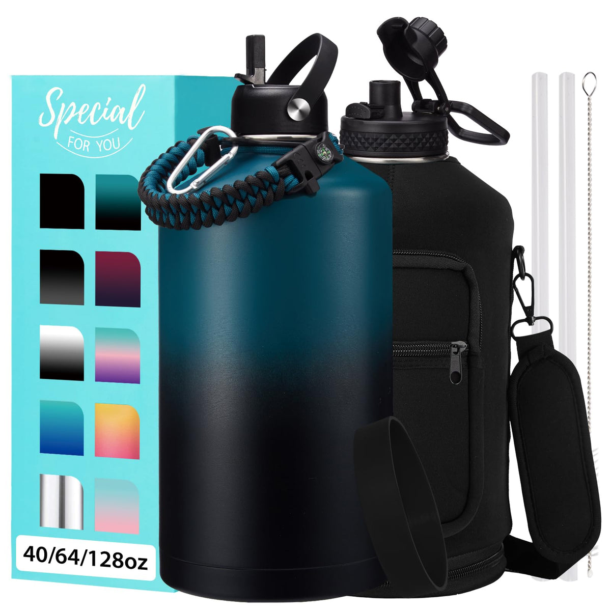 - Q: Can the water bottle be personalized? A: Yes, the water bottle comes with a stylish paracord handle that includes survival tools like a compass and whistle, adding a personal touch.