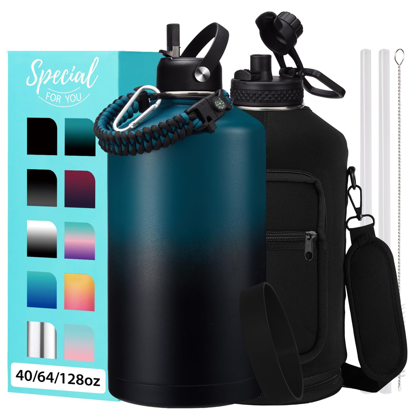 Large Insulated Water Bottles 1 Gallon - Water Jug with Strap Carrier Bag Straw & Spout Lid Paracord Handle Bottle Boot Big Metal Water Flask Stainless Steel Canteen 128oz Insulated Water Bottle