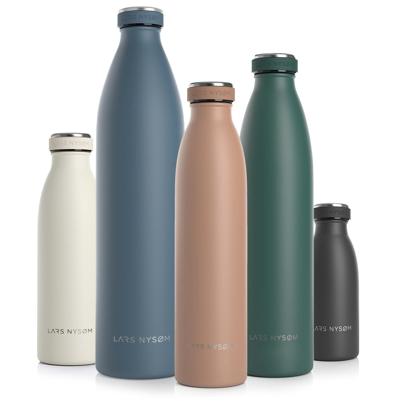 - Q: What sizes are available for the LARS NYSØM Stainless Steel Insulated Water Bottle? A: The LARS NYSØM Stainless Steel Insulated Water Bottle is available in five sizes: 12 ounces, 17 ounces, 25 ounces, 34 ounces, and 51 ounces.