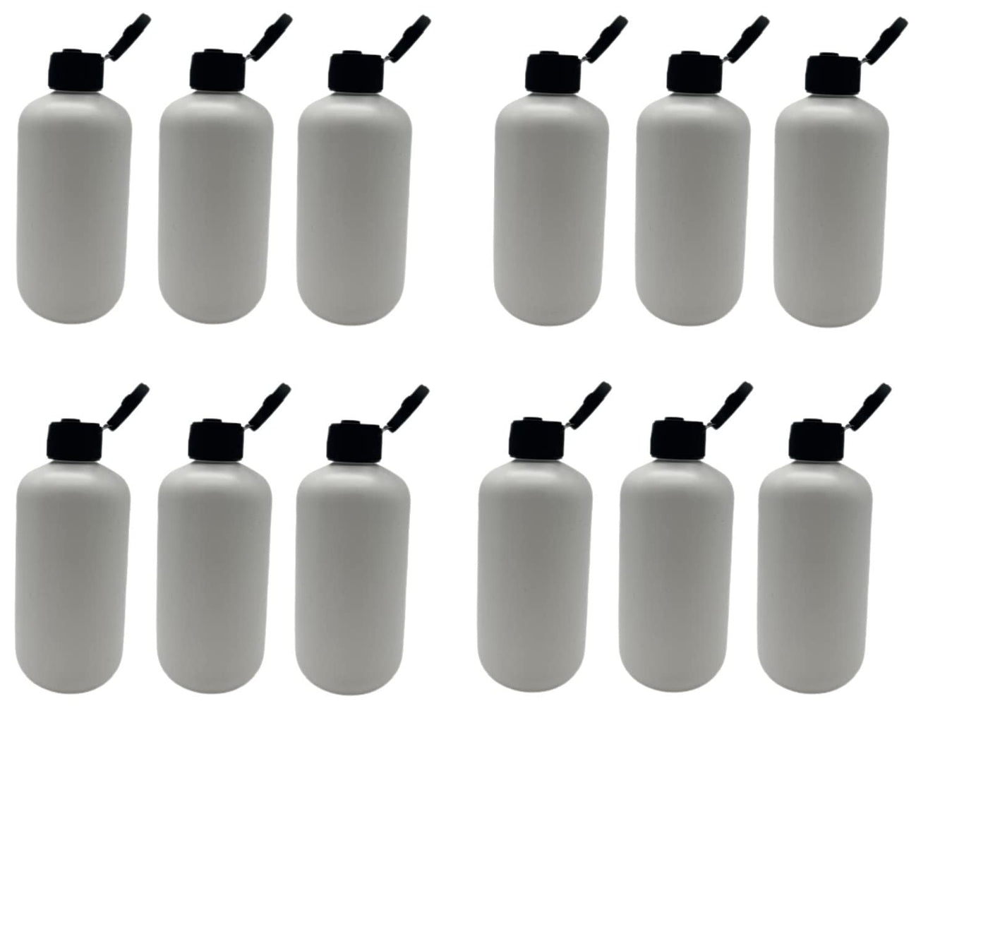 - Q: What is included in the package? A: The package includes 12 packs of 8 oz each white plastic bottles with black flip top snap caps.