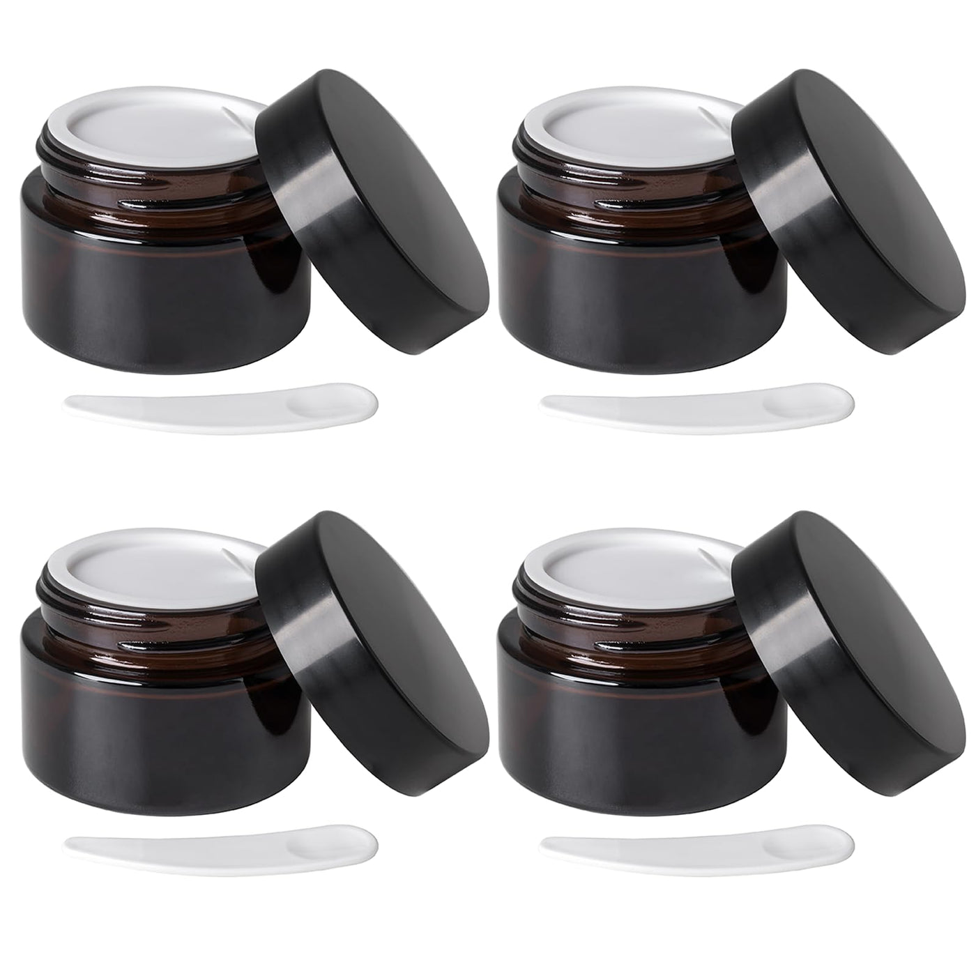 Overnews 4Pcs 1Oz Amber Glass Jar, Empty Cosmetic Lotion Containers,With Inner Liners,Black Lid, Spatula