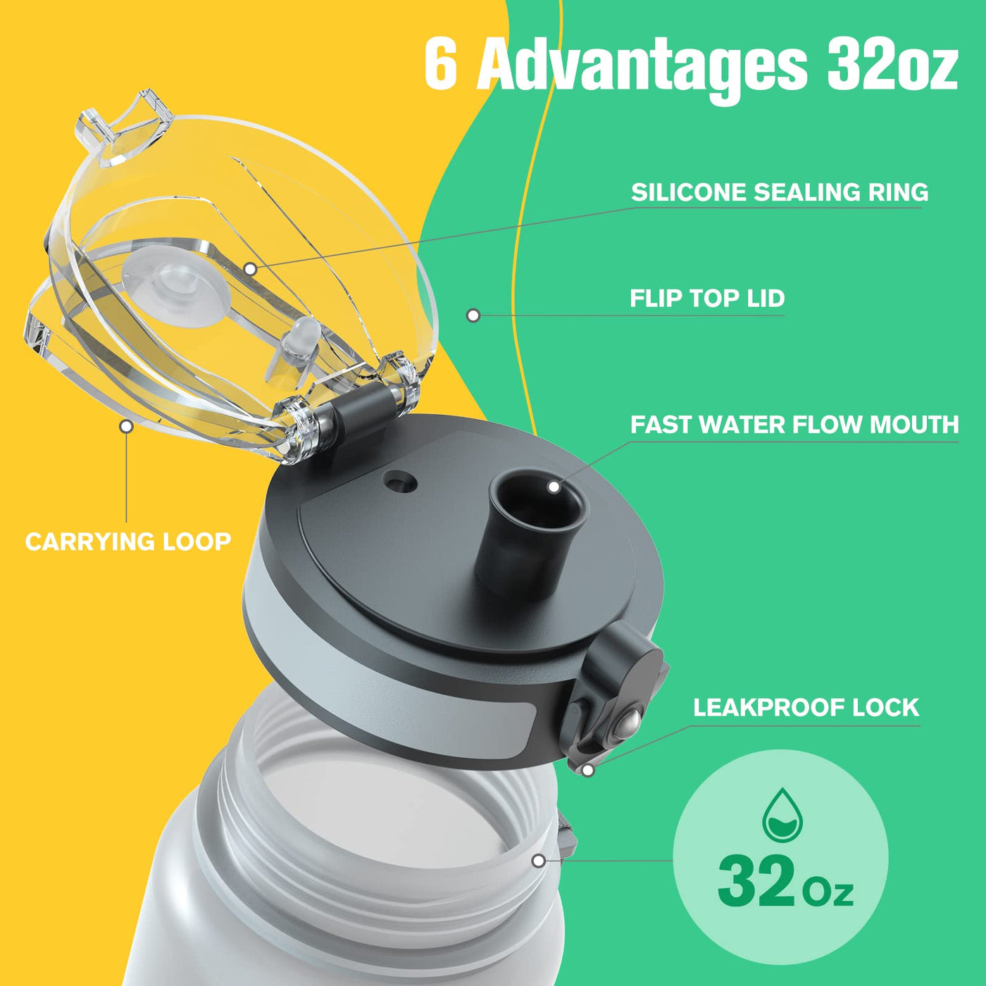Sahara Sailor Water Bottles 32oz Motivational Sports Water Bottle with Time Marker - Times to Drink - Tritan BPA Free Wide Mouth Leakproof Fast Flow Technology with Clean Brush (1 Pack)