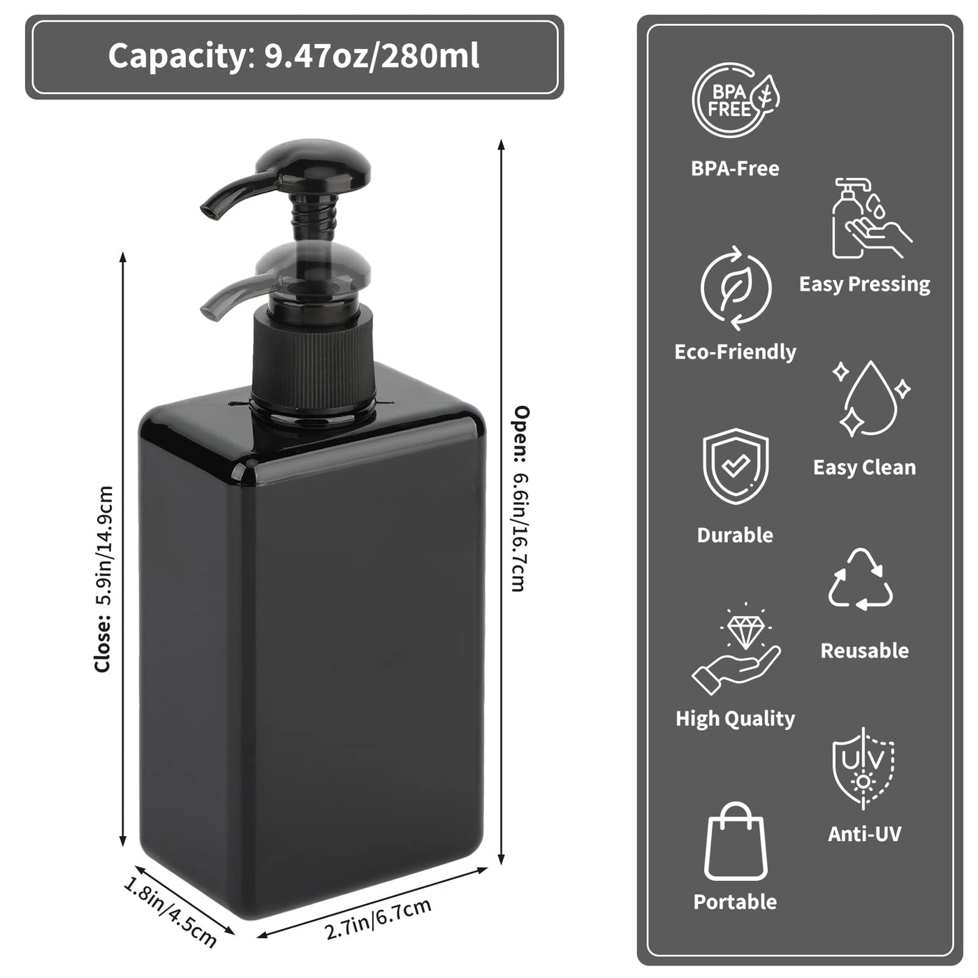 - Q: What is the capacity of each dispenser in the Segbeauty set? A: Each dispenser in the Segbeauty set has a capacity of 9.47 ounces or 280 milliliters.