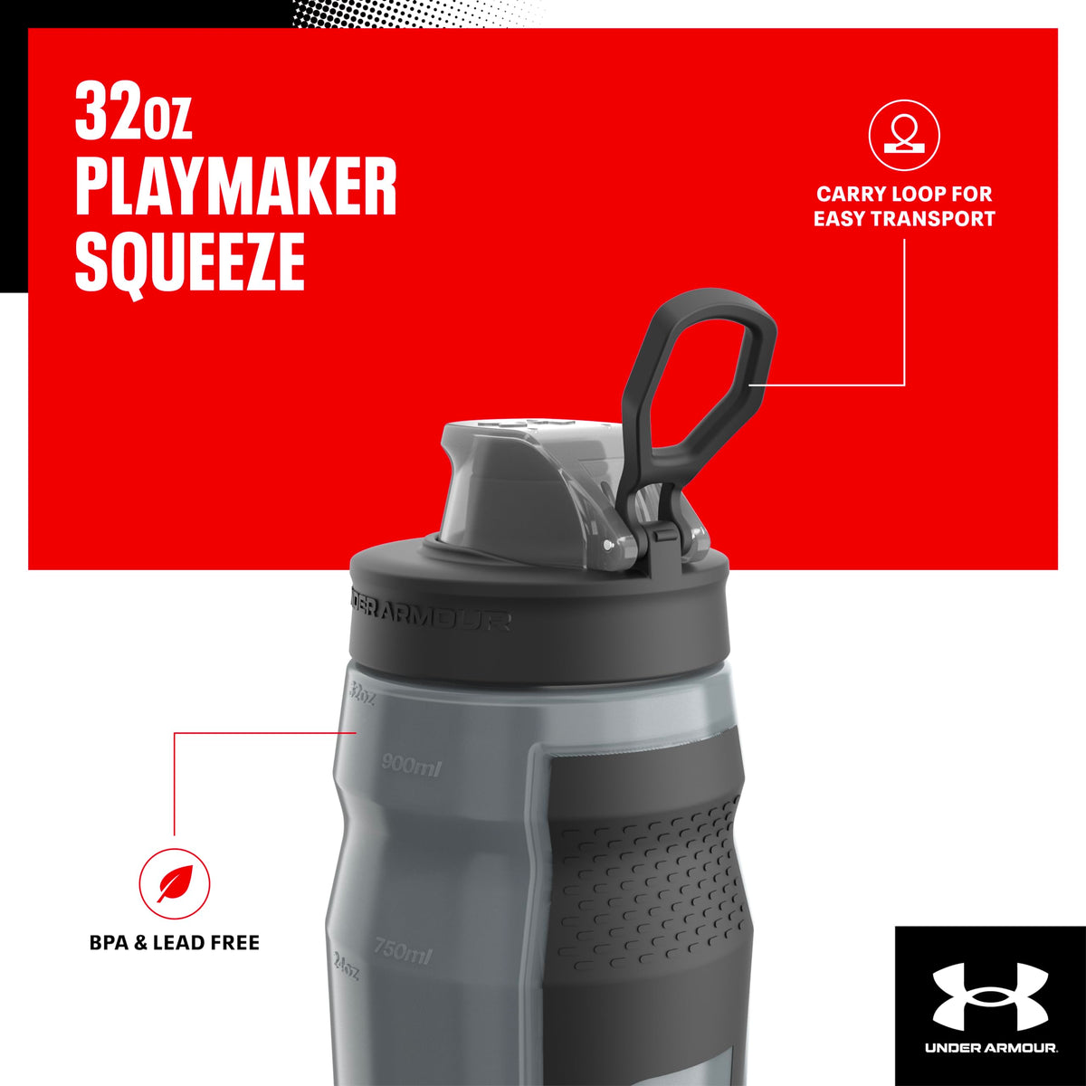 • Q: What is the capacity of the Under Armour Playmaker Squeeze Water Bottle? A: The Under Armour Playmaker Squeeze Water Bottle has a capacity of 32 ounces.