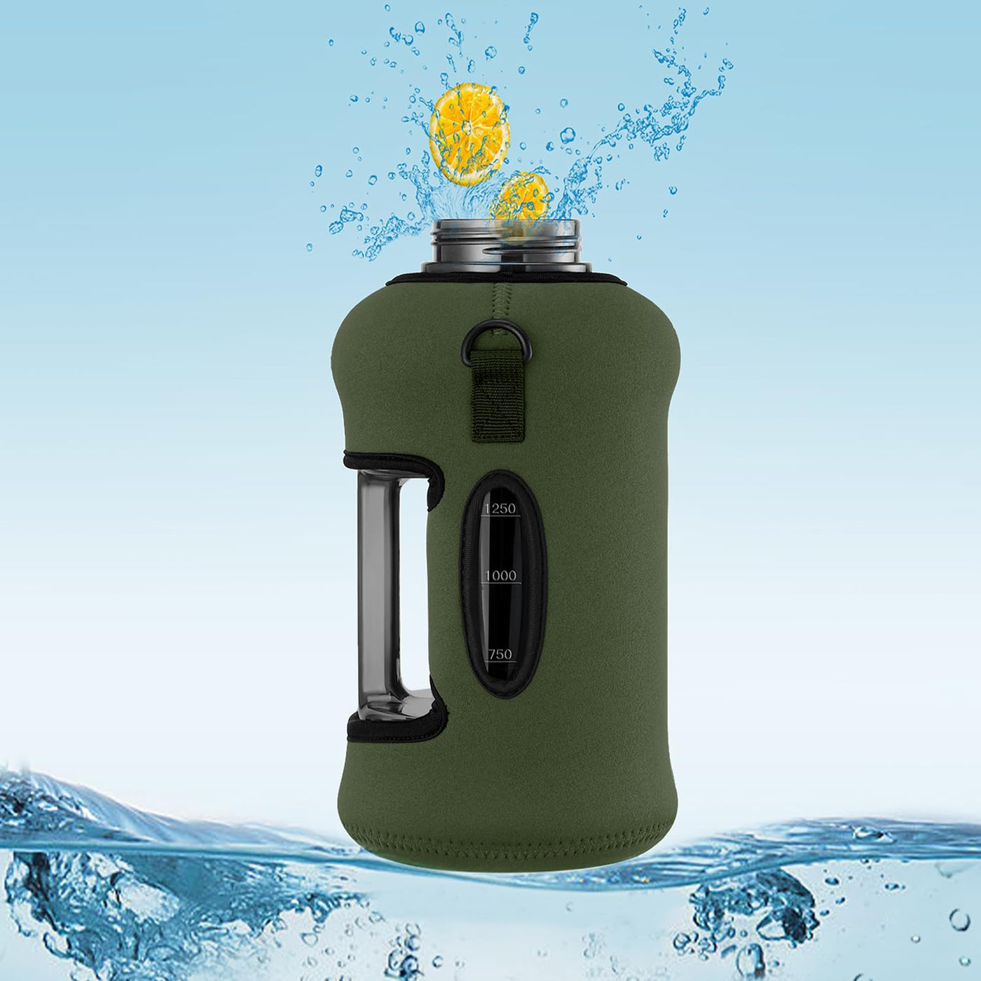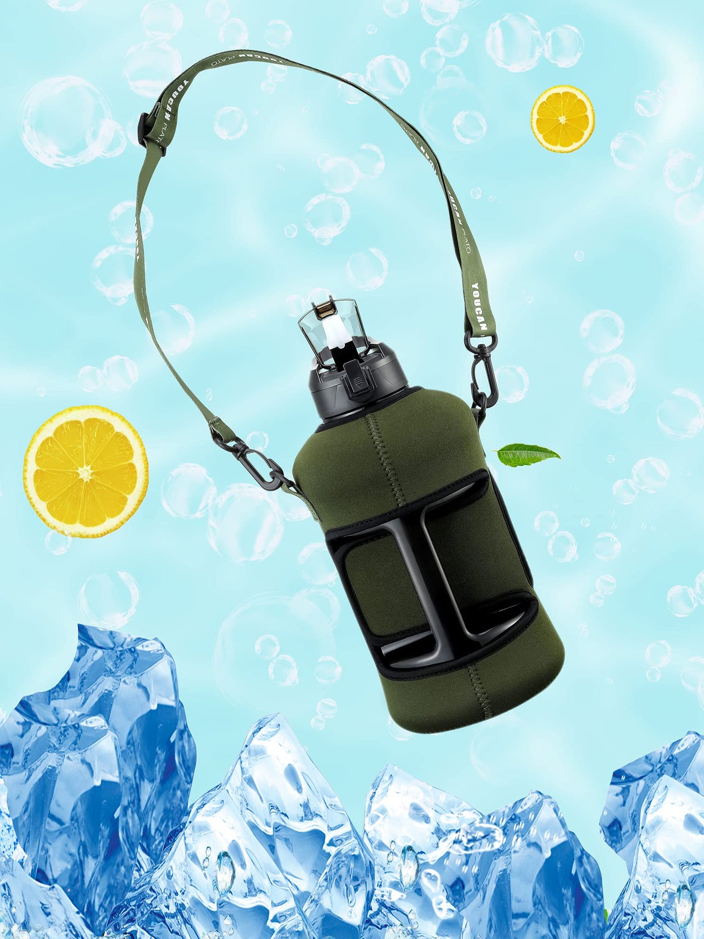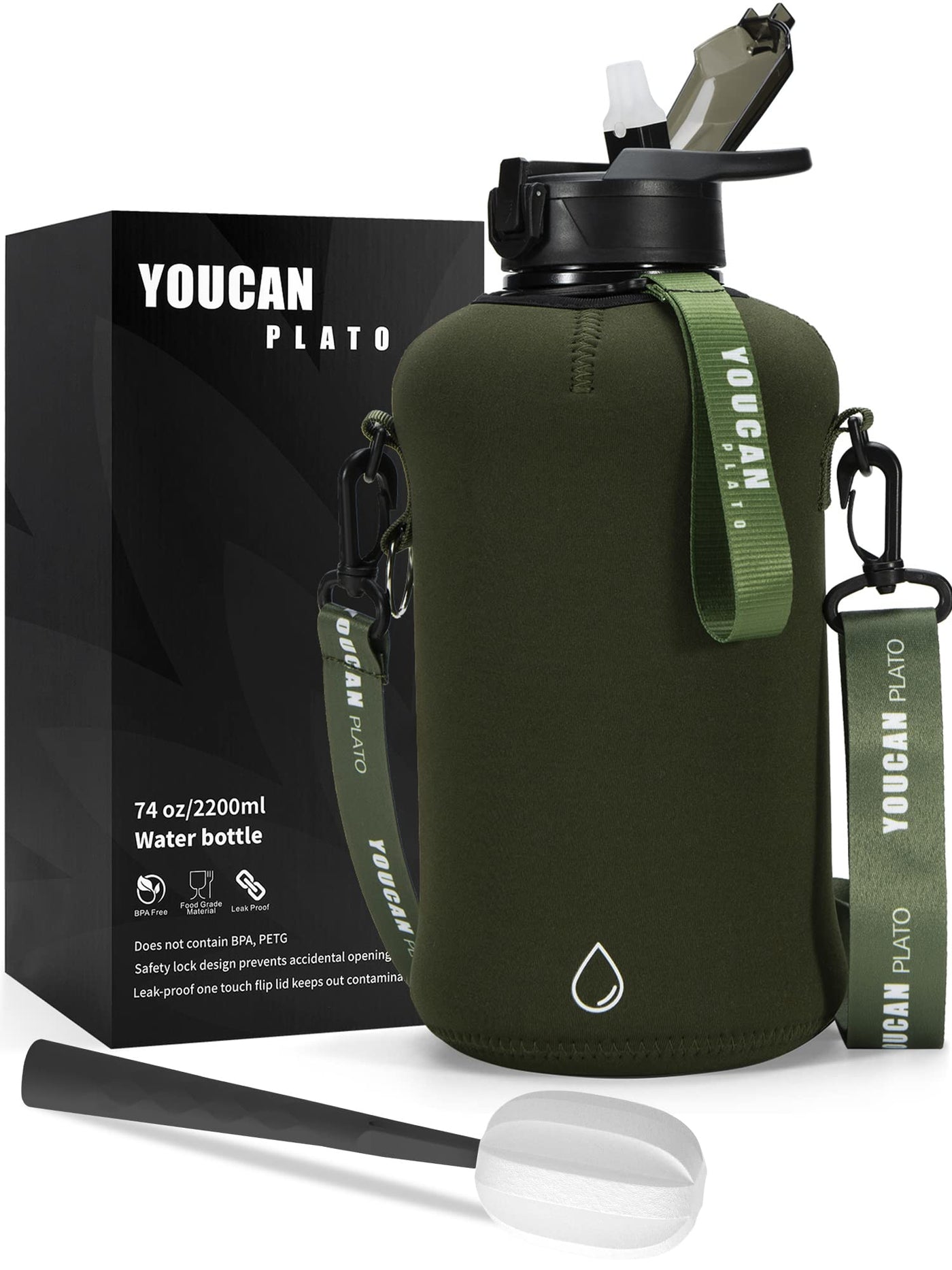 YOUCAN PLATO 64 oz Half Gallon Water Bottle with Sleeve-Large Big Gym Water Bottle with Straw- Gallon Water Jug with Handle and Bottle Brush-BPA Free-2 Liter workout bottle Army Green