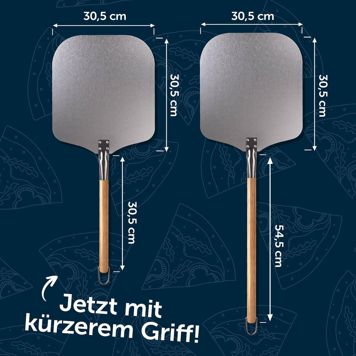 - Q: What are the dimensions of the Blumtal Pizza Peel? A: The Blumtal Pizza Peel has a surface area of 12 inches by 12 inches and a total length of 61 centimeters.