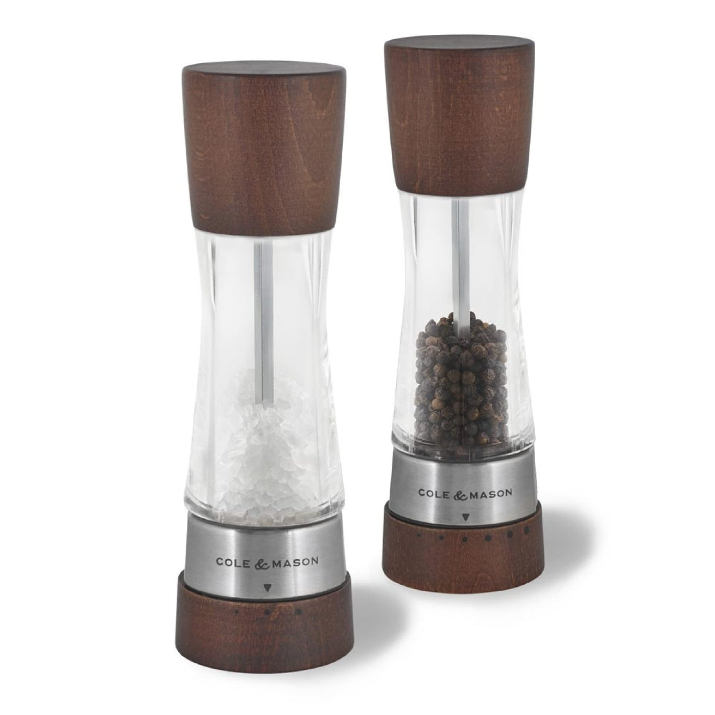 - Q: What materials are used in the Cole & Mason Derwent Grinder Set? A: The Cole & Mason Derwent Grinder Set features durable clear acrylic mills with beech wood finishes, designed for both style and functionality.