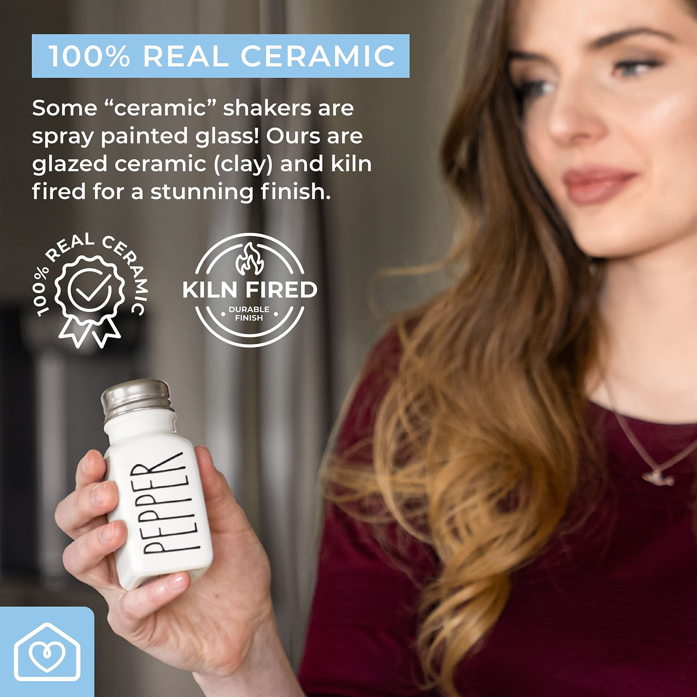 - Q: Are the shakers dishwasher safe? A: Yes, the ceramic salt and pepper shakers are dishwasher safe, thanks to the kiln-fired lettering that won't wear off.