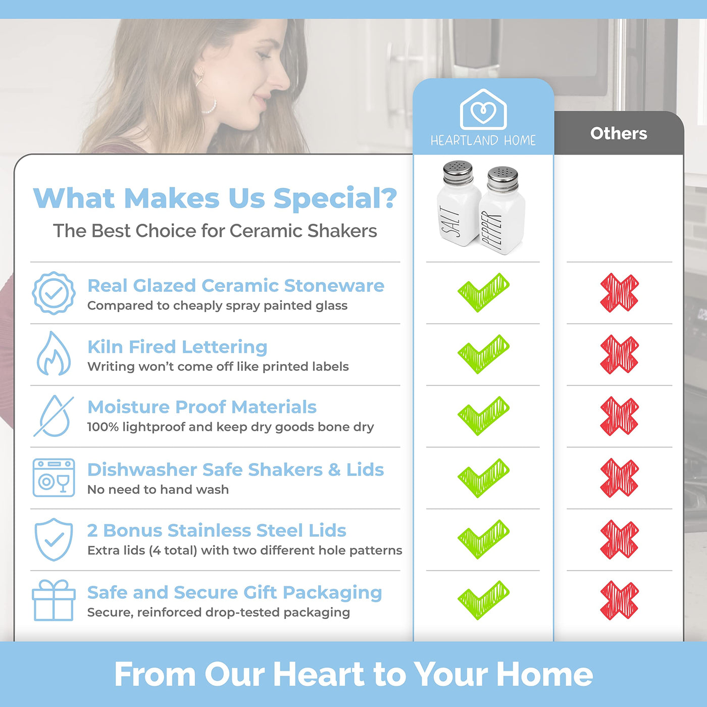 - Q: Do the shakers have any special design features? A: Yes, the shakers feature kiln-fired lettering, which is durable and won't peel or fade over time, adding to their aesthetic appeal.