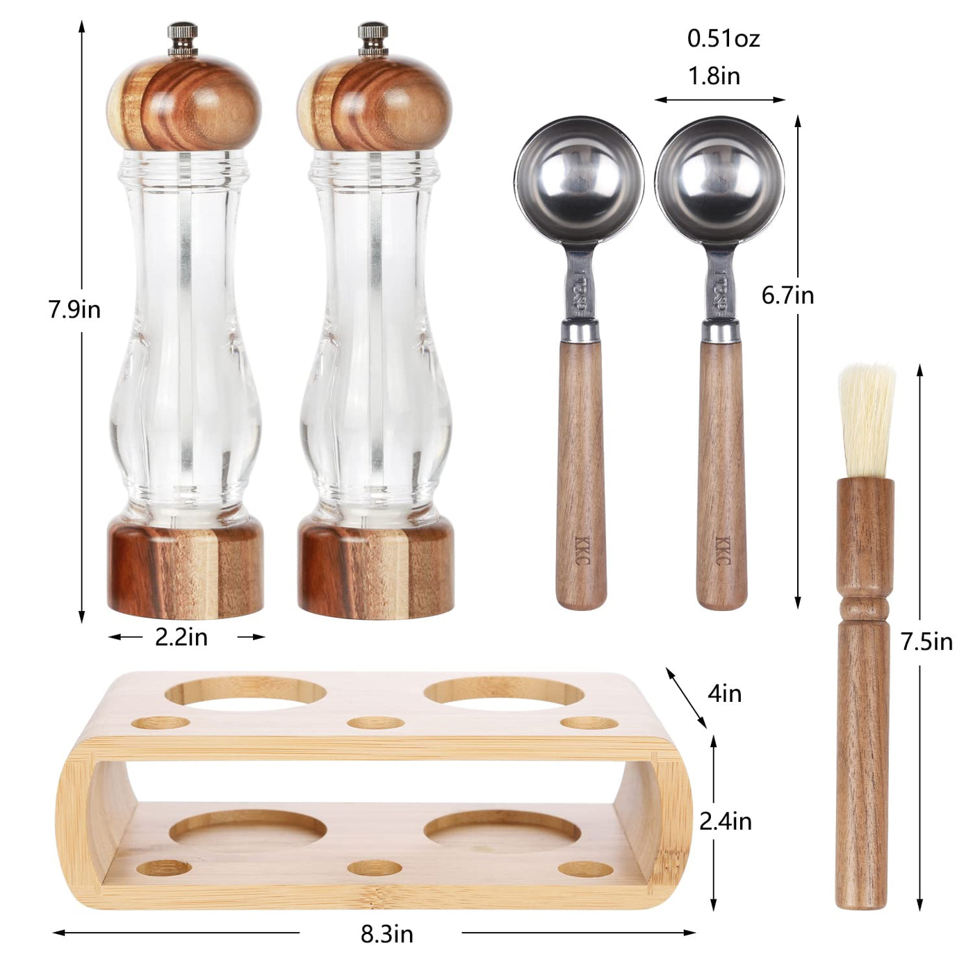 KKC HOME ACCENTS Wooden Salt and Pepper Grinder set with Spoons and Brush Salt and Pepper Mill set 8 inch Refillable Adjustable Coarseness Fine to Coarse