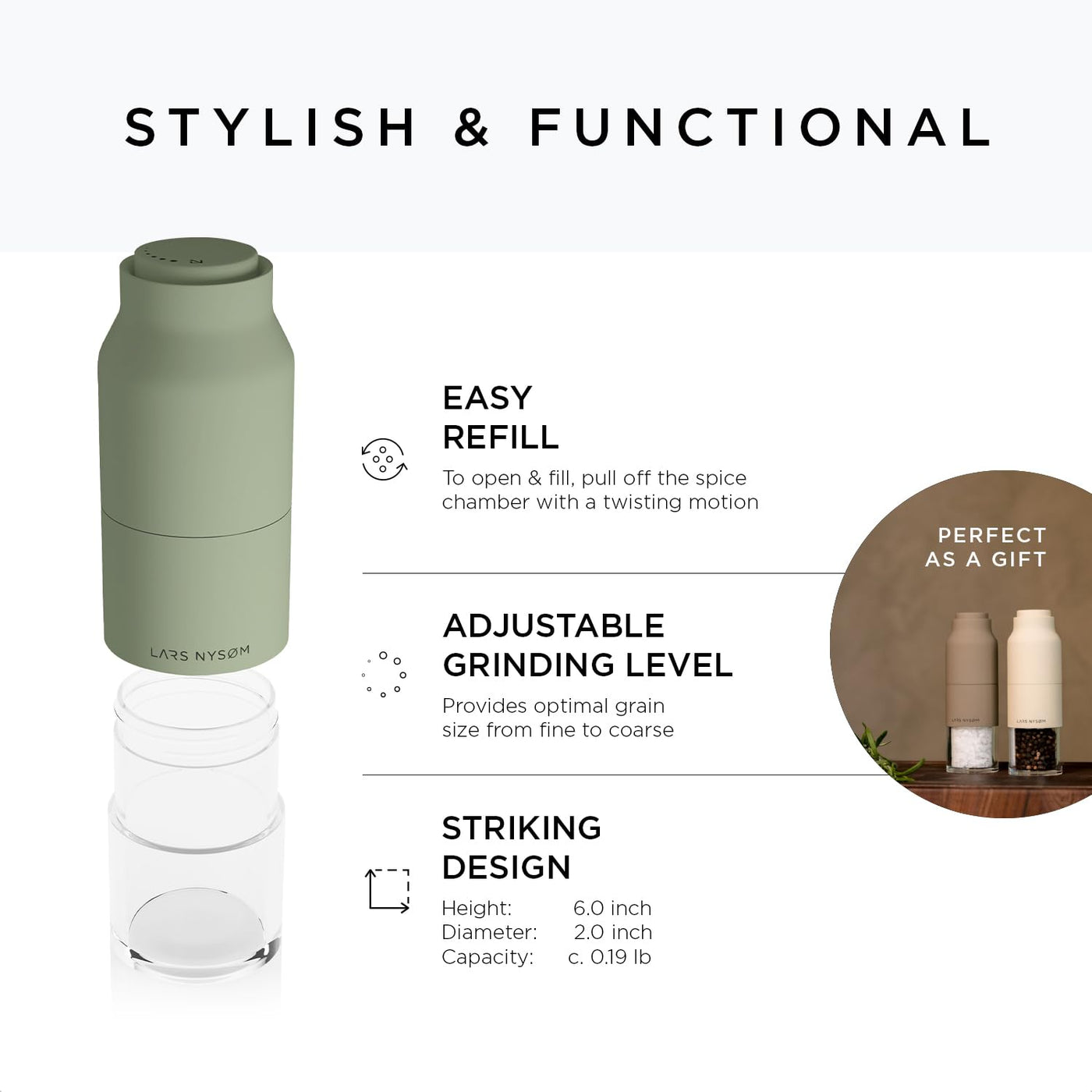 Lars Nysm Stainless Steel Salt And Pepper Mill Set With Adjustable Ceramic Grinder I Manual Spice Mill Set (Sage)