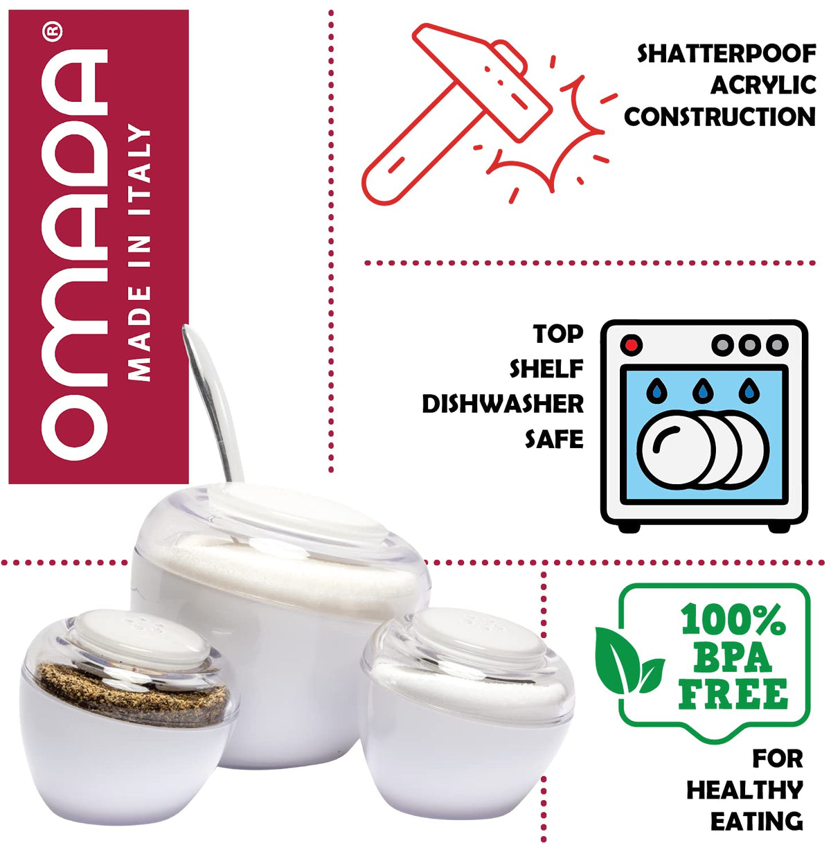 - Q: What materials are the Omada Sugar Bowl and Shakers made from? A: These kitchen accessories are made from durable acrylic, crafted in Italy, ensuring both longevity and a stylish appearance.