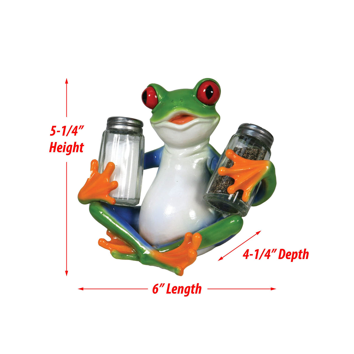 - Q: What are the dimensions of the Rivers Edge Products Tree Frog Salt and Pepper Shakers? A: The salt and pepper shaker set measures 6 inches long, 4.25 inches wide, and 5.25 inches tall.