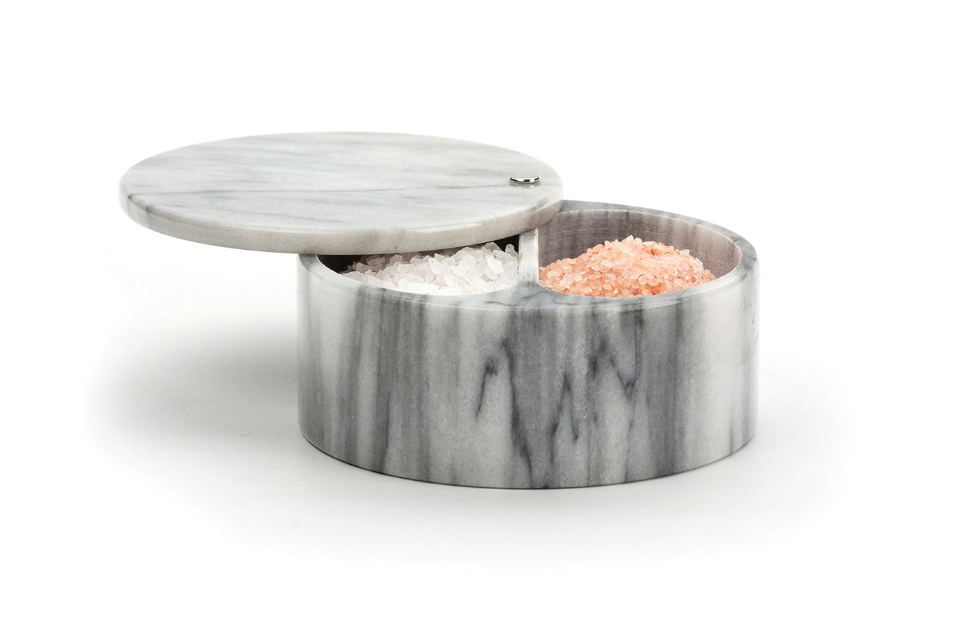 RSVP International Dual Compartment Box | Chic & Modern Herb Container | 10 Ounces Total | Swivel Top Protects Salts | Beautiful Solid Marble 5'' White