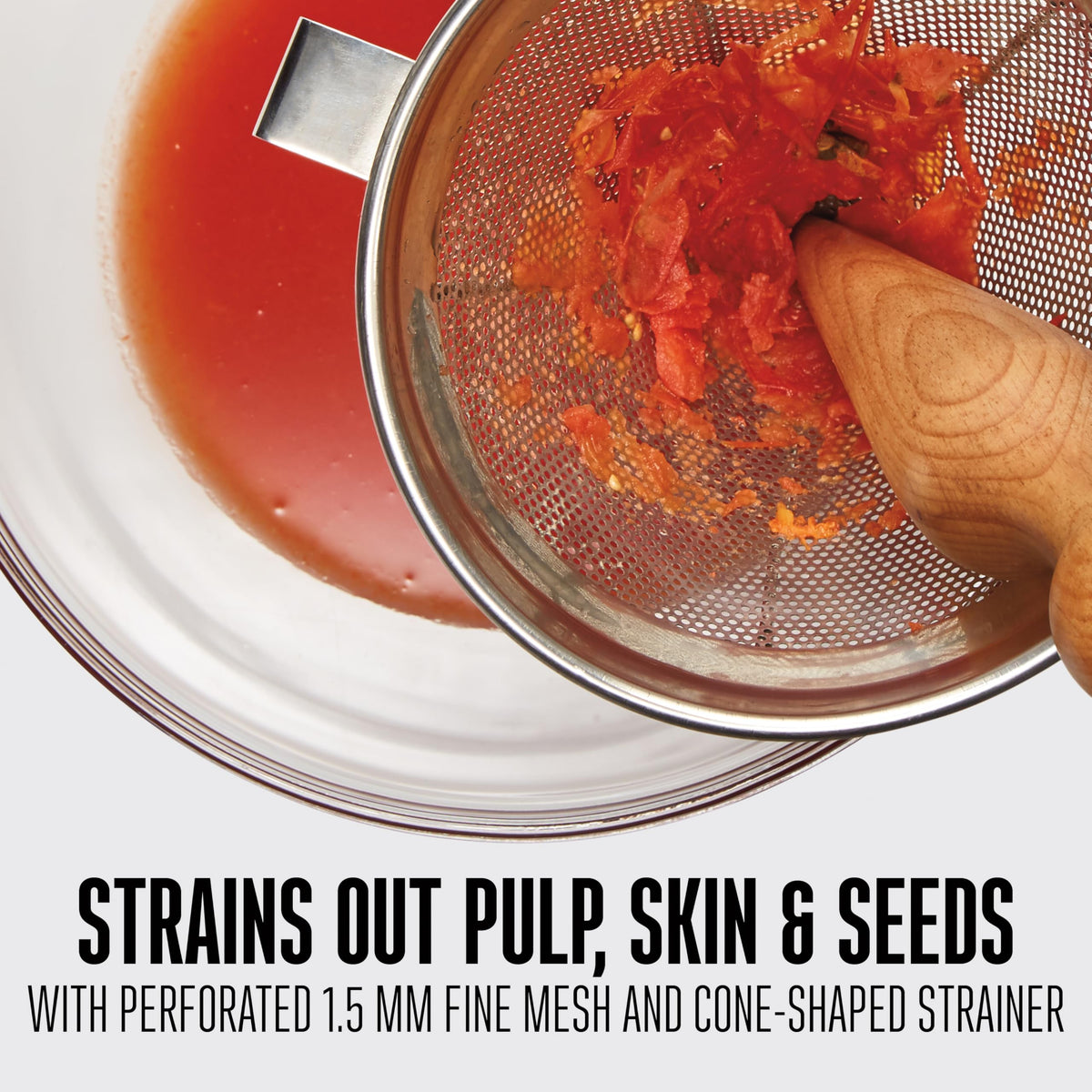 - Q: How does the strainer prevent pulp and seeds from getting through? A: The cone strainer features a perforated 2-mm fine mesh design that effectively prevents pulp, skins, and seeds from slipping through.