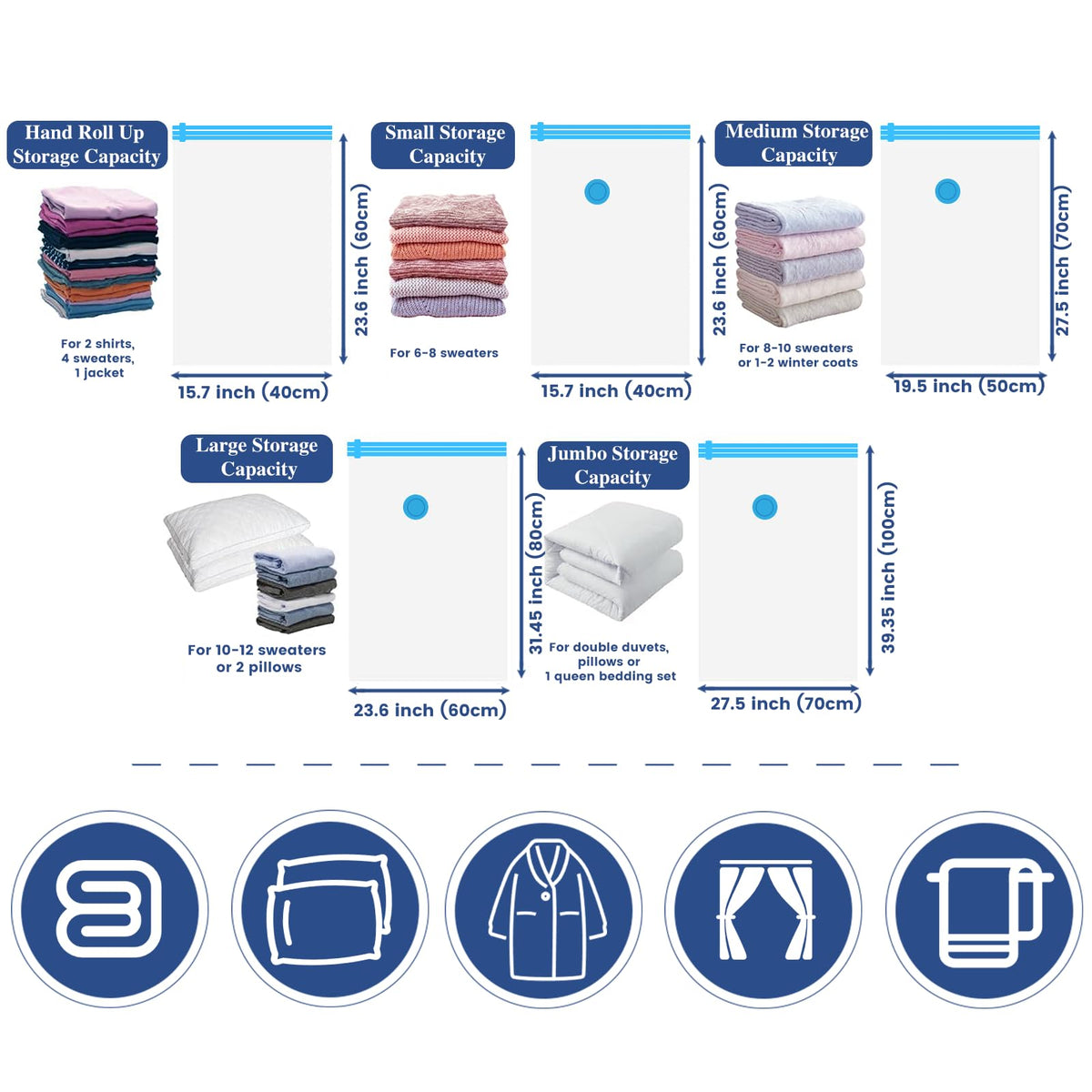 • Q: Are the vacuum storage bags suitable for any type of clothing? A: Yes, these bags are suitable for various types of clothing, including comforters, blankets, bed sheets, and other soft items, making them perfect for home organization and travel.